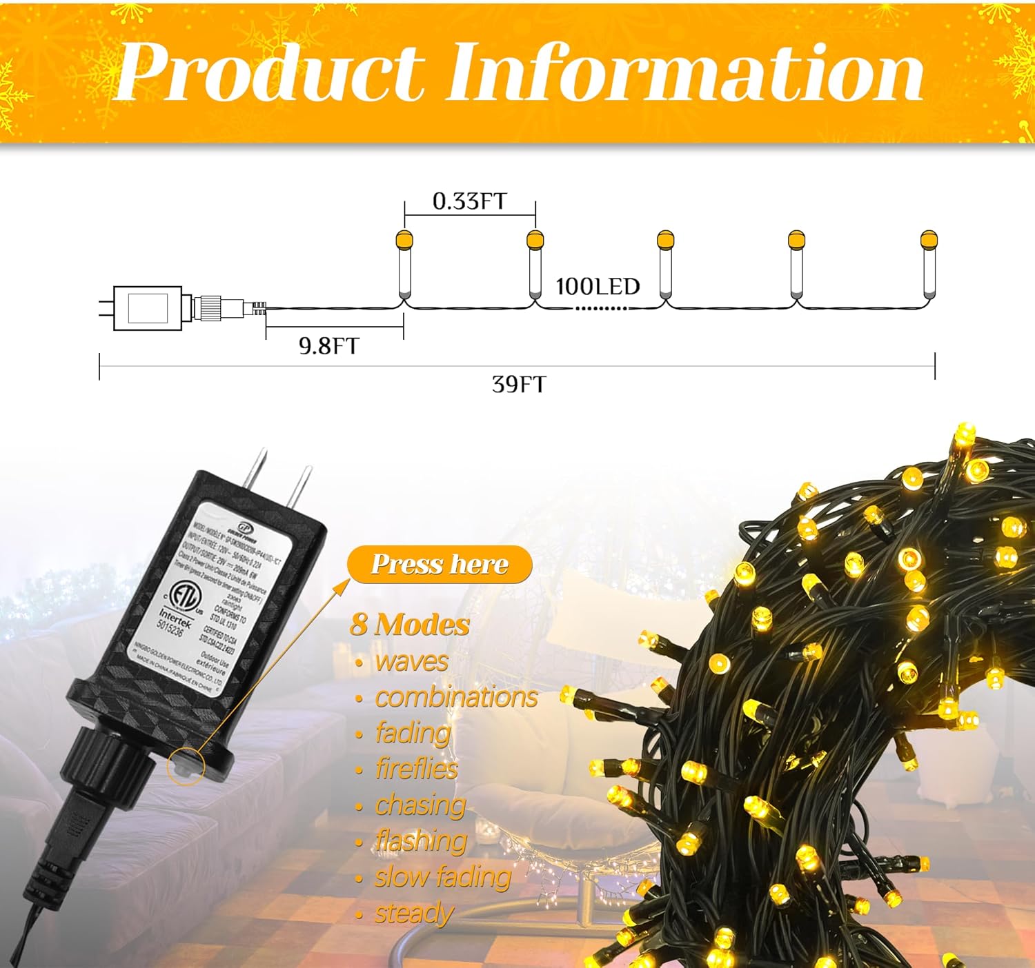100 LED Christmas String Lights, 39FT Indoor Lights Plug-in with 8 Modes & Timer & Memory Function, Waterproof Christmas Lights Outdoor for Holiday Party Christmas Tree Decor