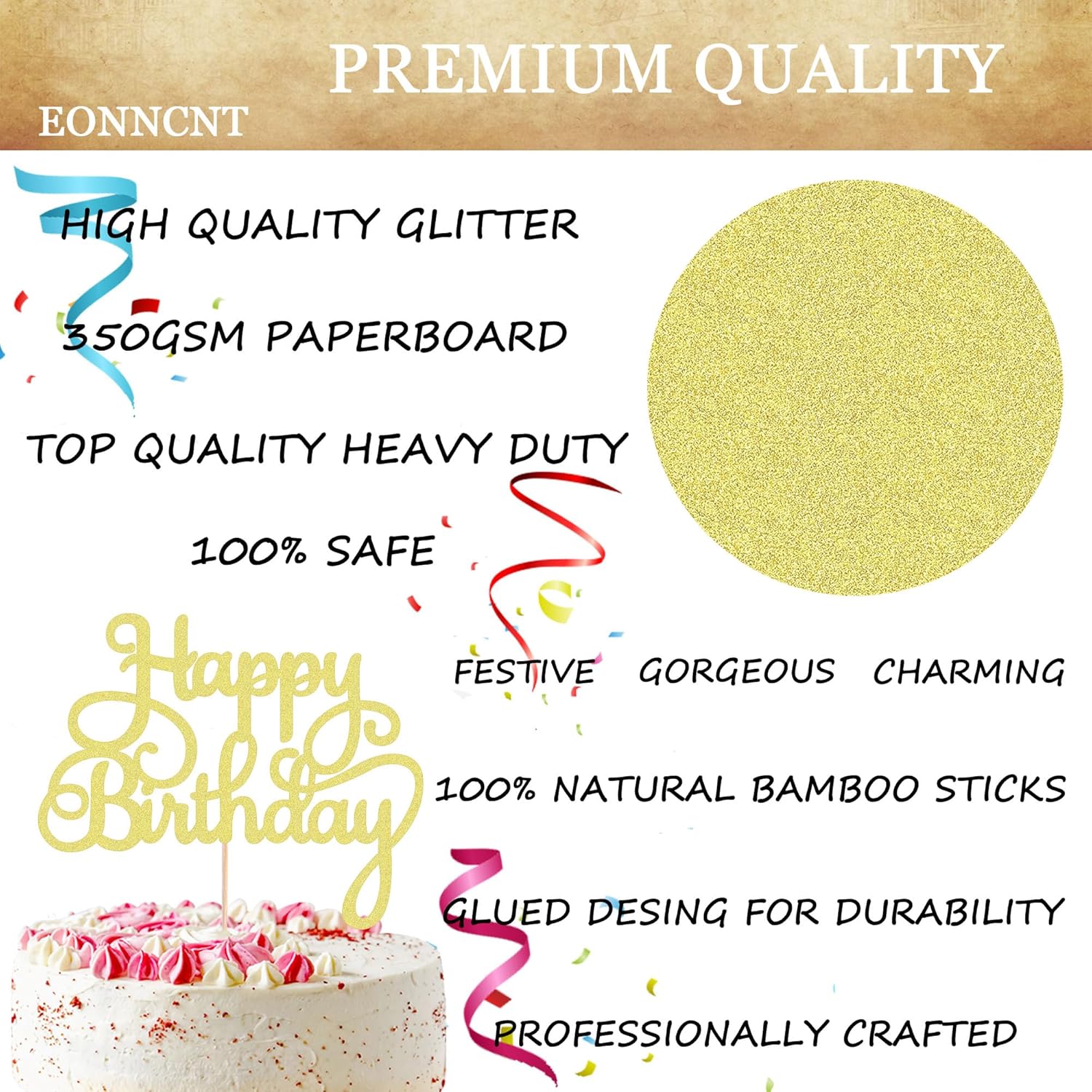 - HIGH QUALITY CARDSTOCK - Each happy birthday cake topper is made of golden 350GMS thick cardboard, which is sturdy and durable, effectively preventing damage during transportation. This happy birthday cake topper is a true golden flash that shines from every angle, providing a unique touch and illuminating the entire gathering venuedecor