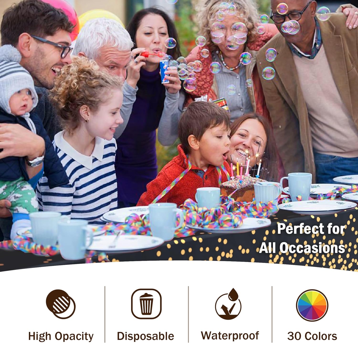 - HIGH OPACITY: covers any table with minimal transparency. Great plastic tablecoth for parties, weddings, holdiay party, , birthday parties, christmas, thanksgiving dinner, bbq, and any other color themed event.