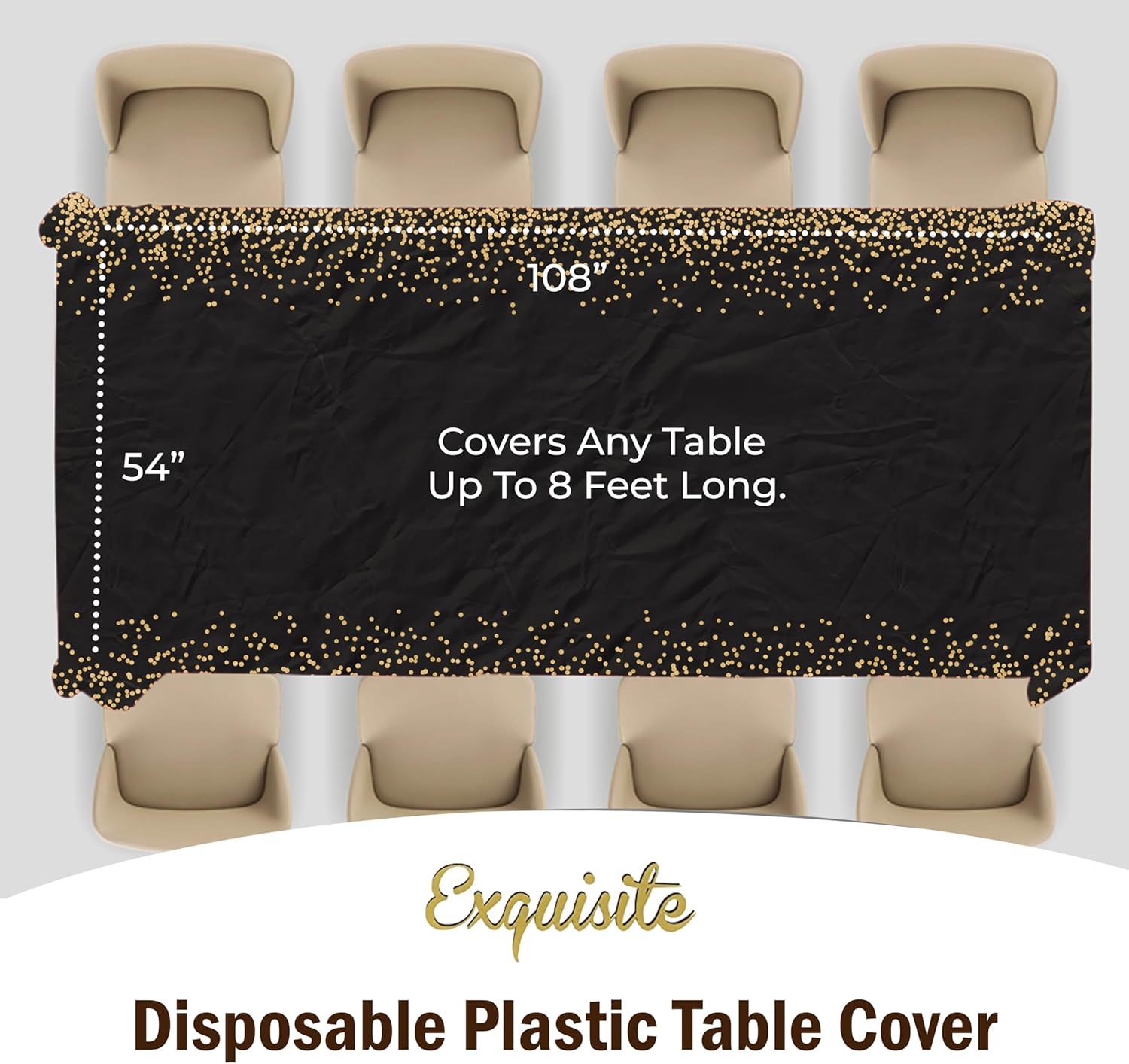 - PREMIUM QUALITY PROTECTION: This 12 pack of 54 in. x 108 in. Rectangle Black with Gold Dots plastic tablecloths will cover any table up to 8 feet. Unlike your typical paper table clothes these disposable table covers for parties are spill and waterproof!!!
