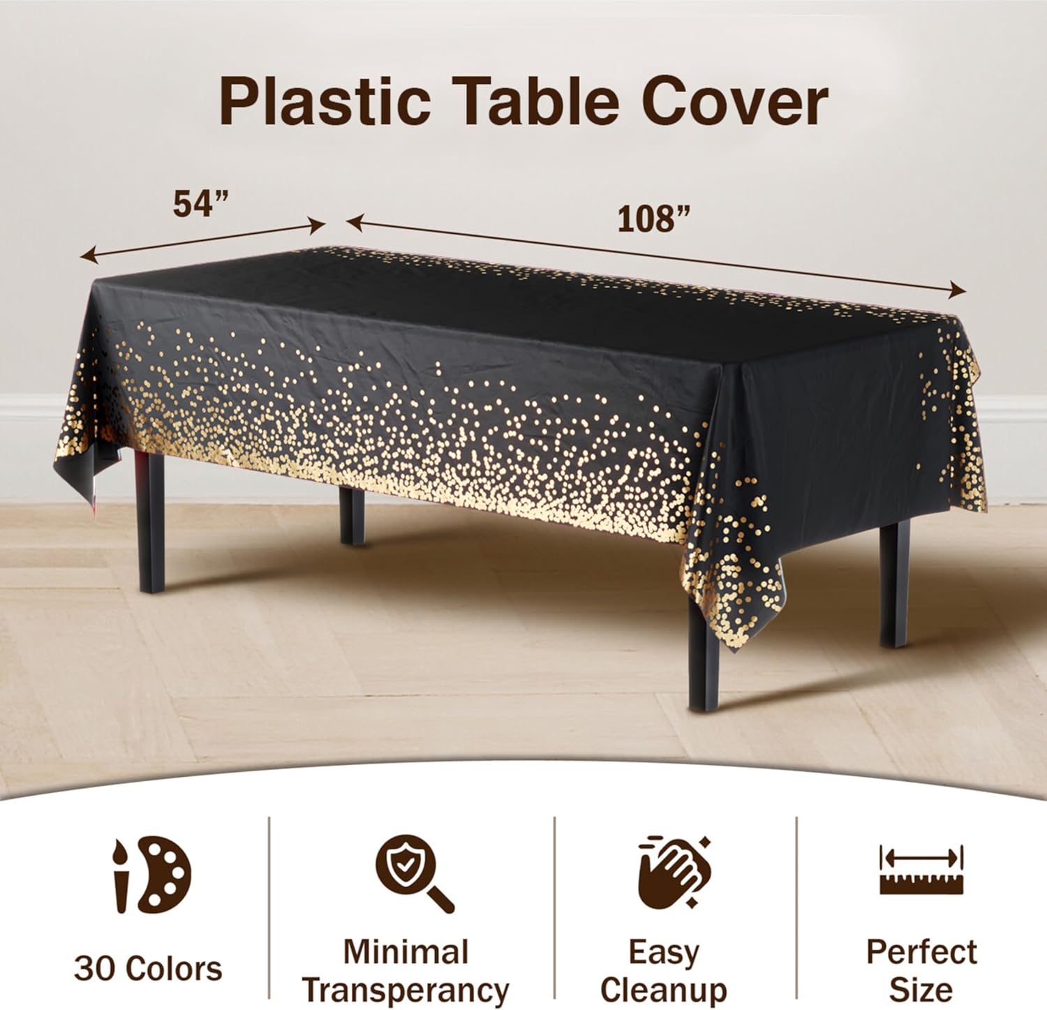 - INCLUDES: 12 heavy duty disposable Black with Gold Dots plastic table cloth that will cover your table for protection and is great for homes with children, kitchen tables, dinning tables, dinners, family outings. bbq's and more!!!