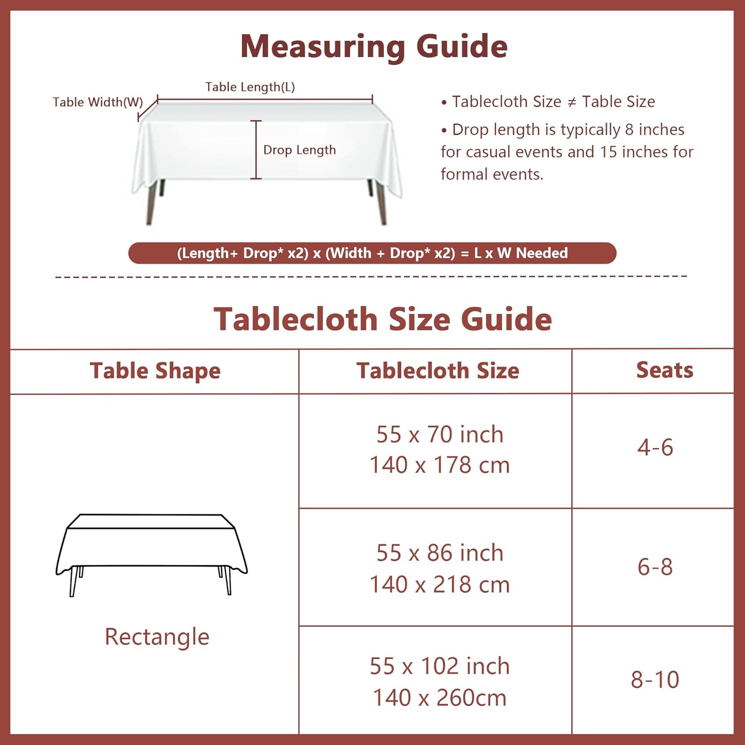 - Dimensions: Tablecloth size 55x86" fit for 6-8 seats. Measure the size of the table, it is recommended to increase the table length by more than 20 inches (10 inches on one side) to get a better drop effect. Sold in piece (1pc ablecloth in each package).