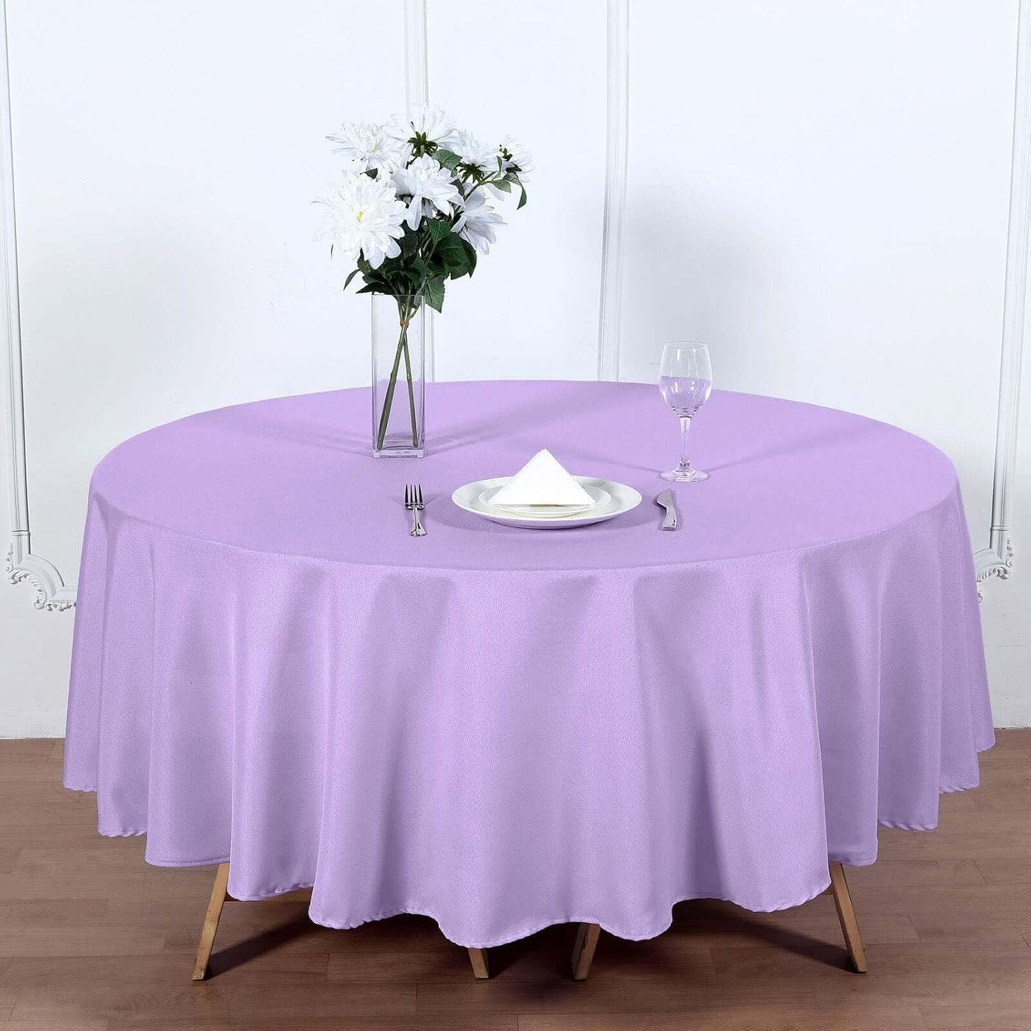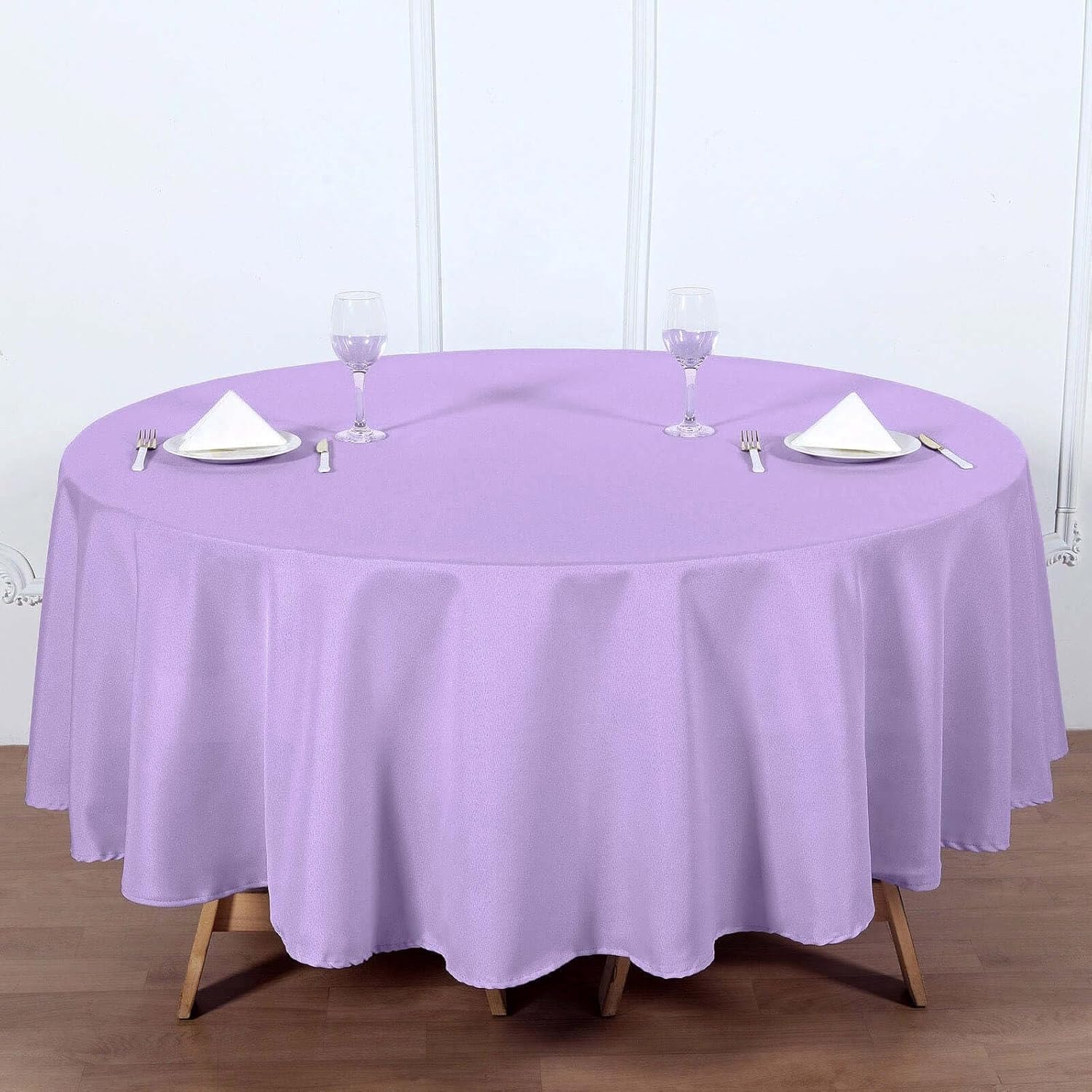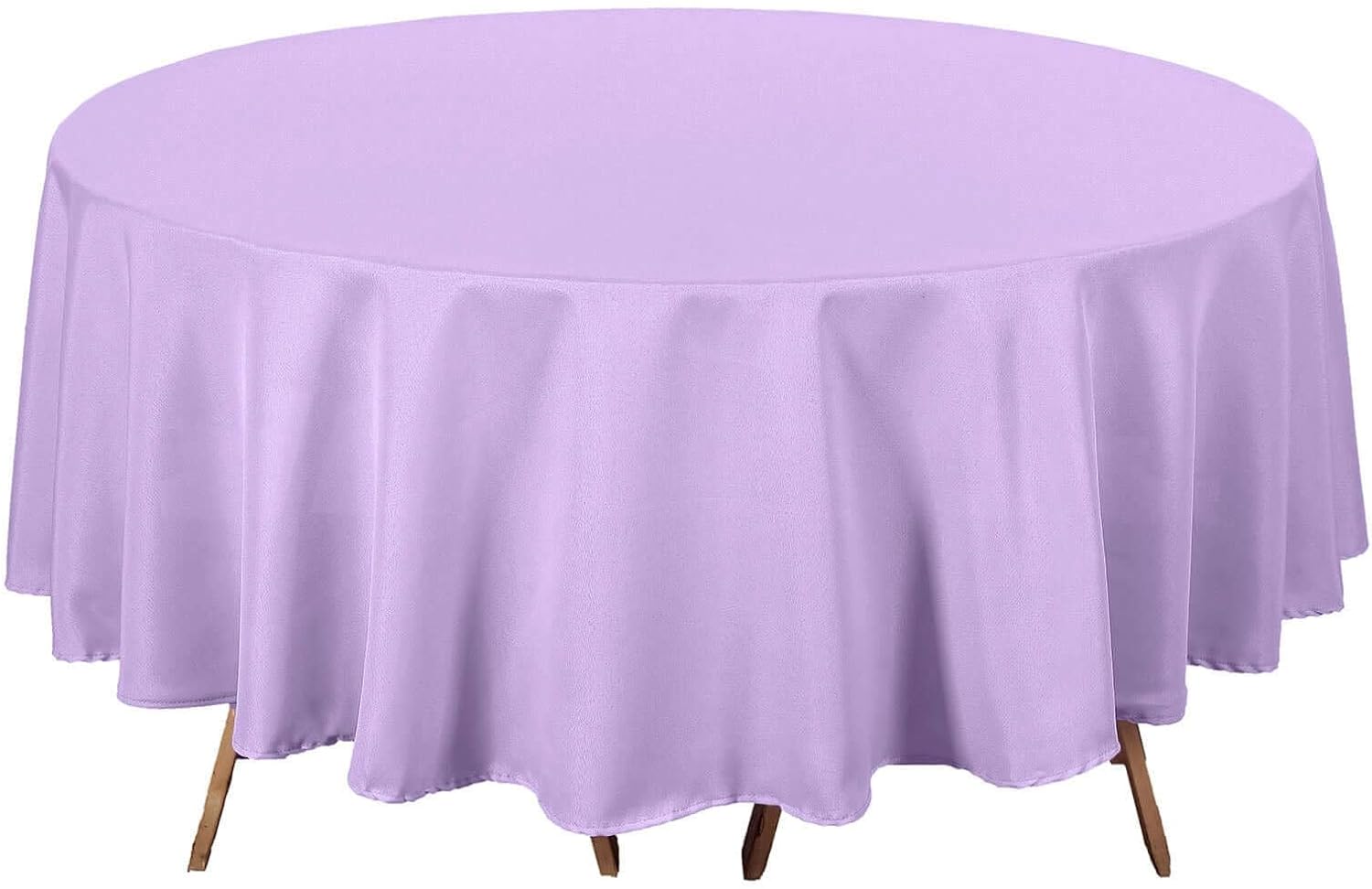 - Quantity: 1 Tablecloth Material: 100% Polyester Color: Lavender Size: 90" Round 1 piece, seamless design Stain & Wrinkle Resistant, Machine Washable Hemmed edges for an exquisite look. All sizes are approximate measurements Due to different light settings the actual color might vary a bit from the pictures.