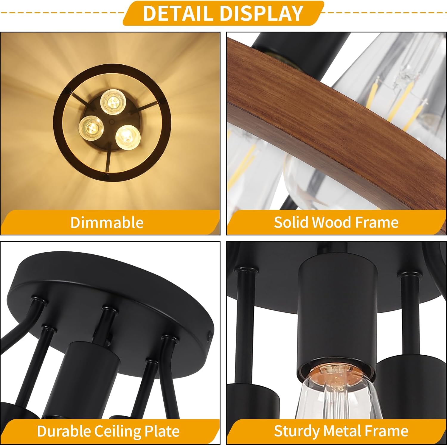 Modern Farmhouse Wood Semi Flush Mount Ceiling Light, Hallway Entryway Light Fixtures, 3-Light Rustic Industrial Ceiling Lamp for Kitchen Bedroom Dining Room Laundry Room Lighting, UL-Listed