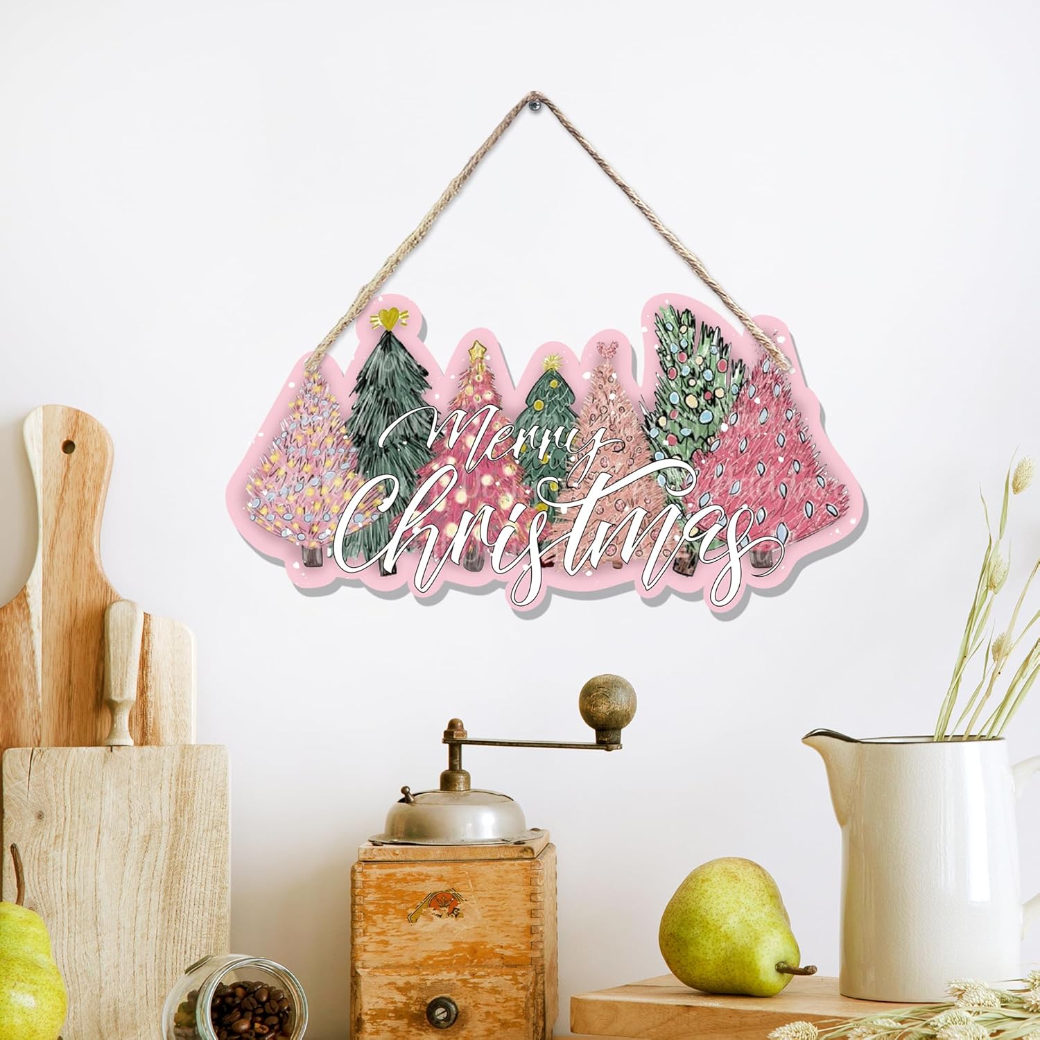 CGBHW Pink and Green Christmas Tree Wooden Sign, Merry Christmas Decoration Hanging Sign Wall Decor, Pink Christmas Holidays Theme for Home Office Girls College Dorm Door Decor 12 x 6 Inch