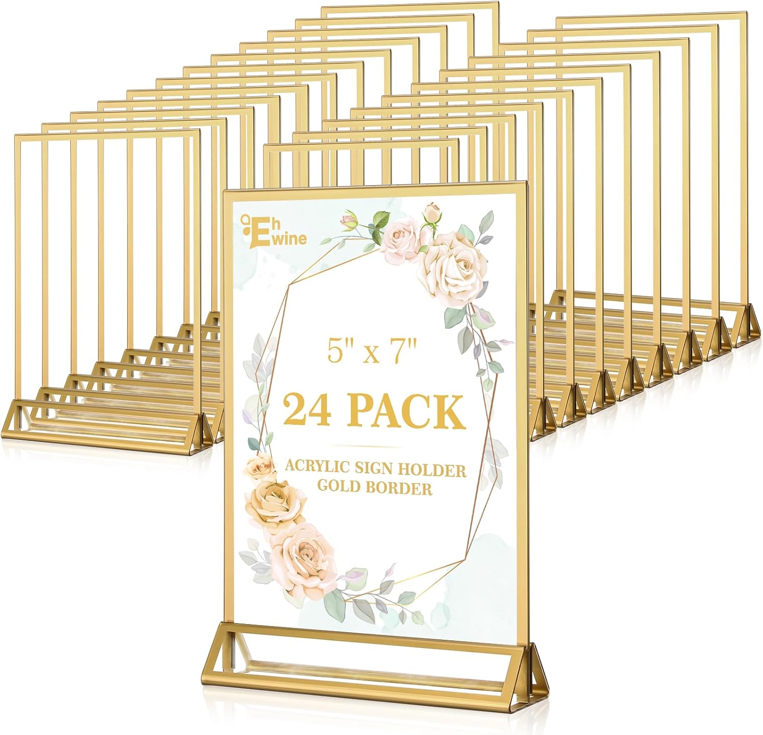 EHWINE 24 Pack Acrylic Sign Holder 5 x 7, Double Sided Gold Picture Frame Stand up Table Top Sign Holders, Clear Display Stand Menu Flyer Holder for Wedding Party