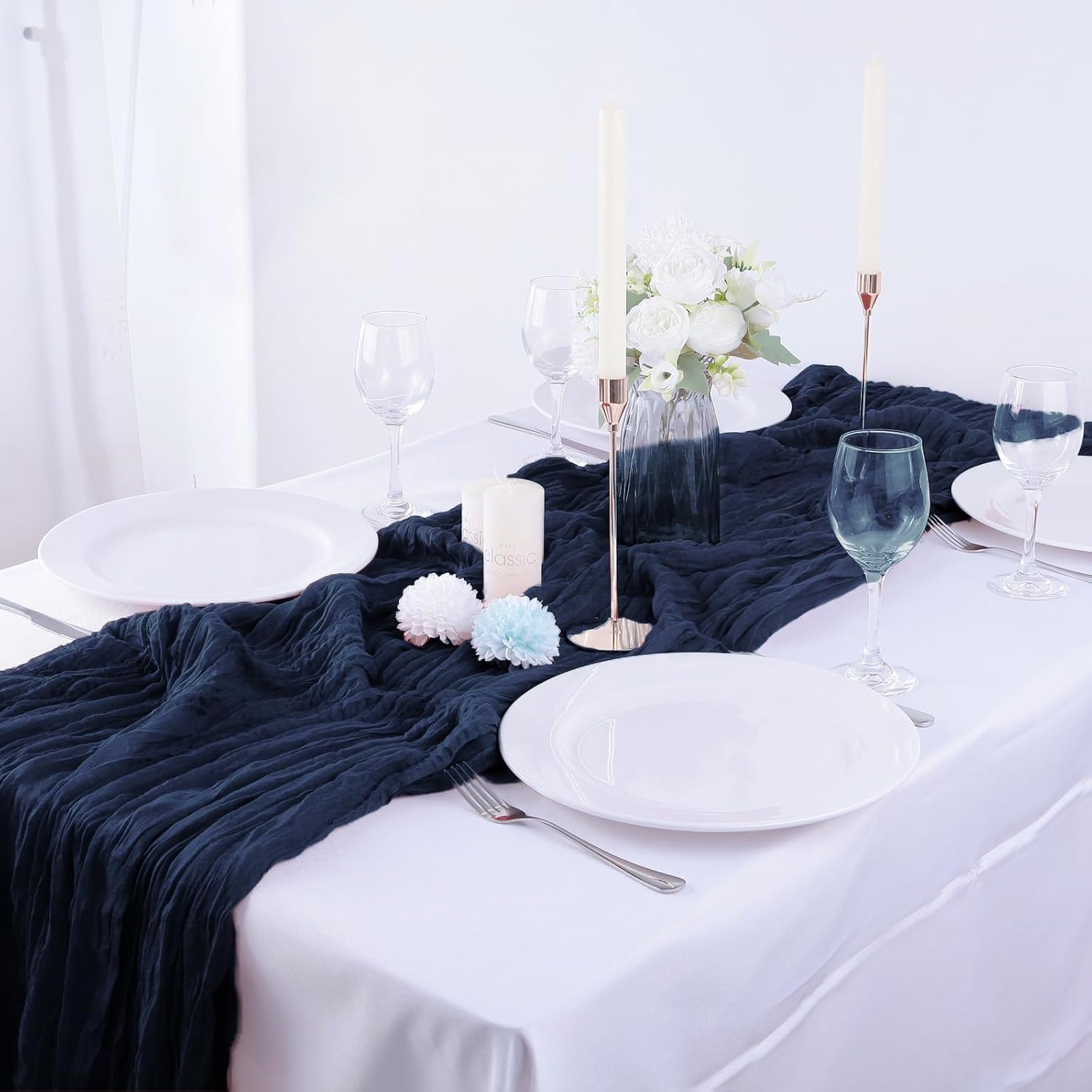 Boho Gauze 16PCS Navy Blue Cheesecloth Table Runners - 35x120Inch Long Rustic Sheer Table Decor for Wedding, Party, Baby, Bridal Shower