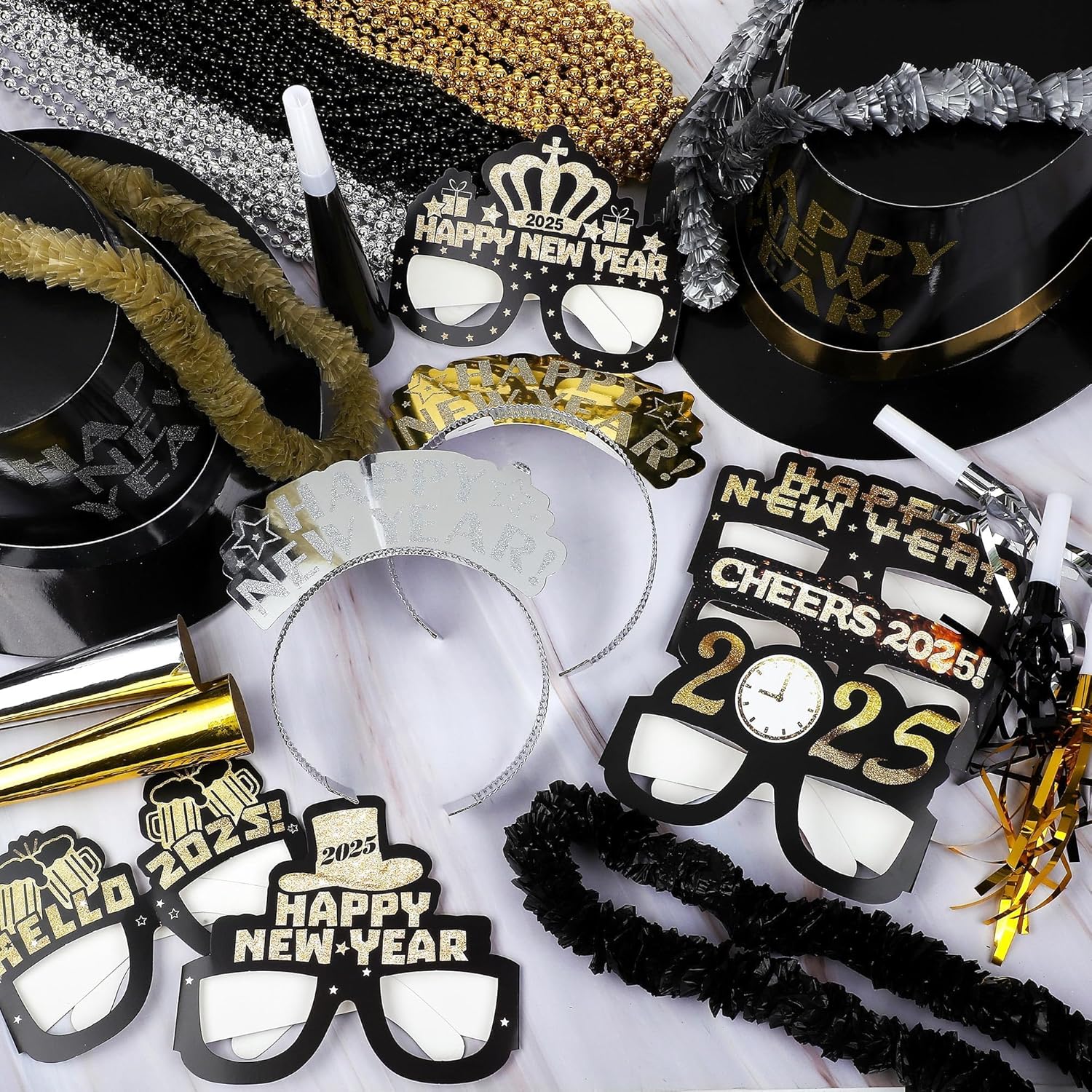 - Material information: the new year top hats and glasses are made of cardboard, the horns are made of plastic and paper, the noisemakers are made of plastic and tassel, the headbands are made of plastic and paper, the bead necklaces and leis are made of plastic; our materials are safe and non-toxic, allowing you to use the New Year's 2025 party kit with confidence