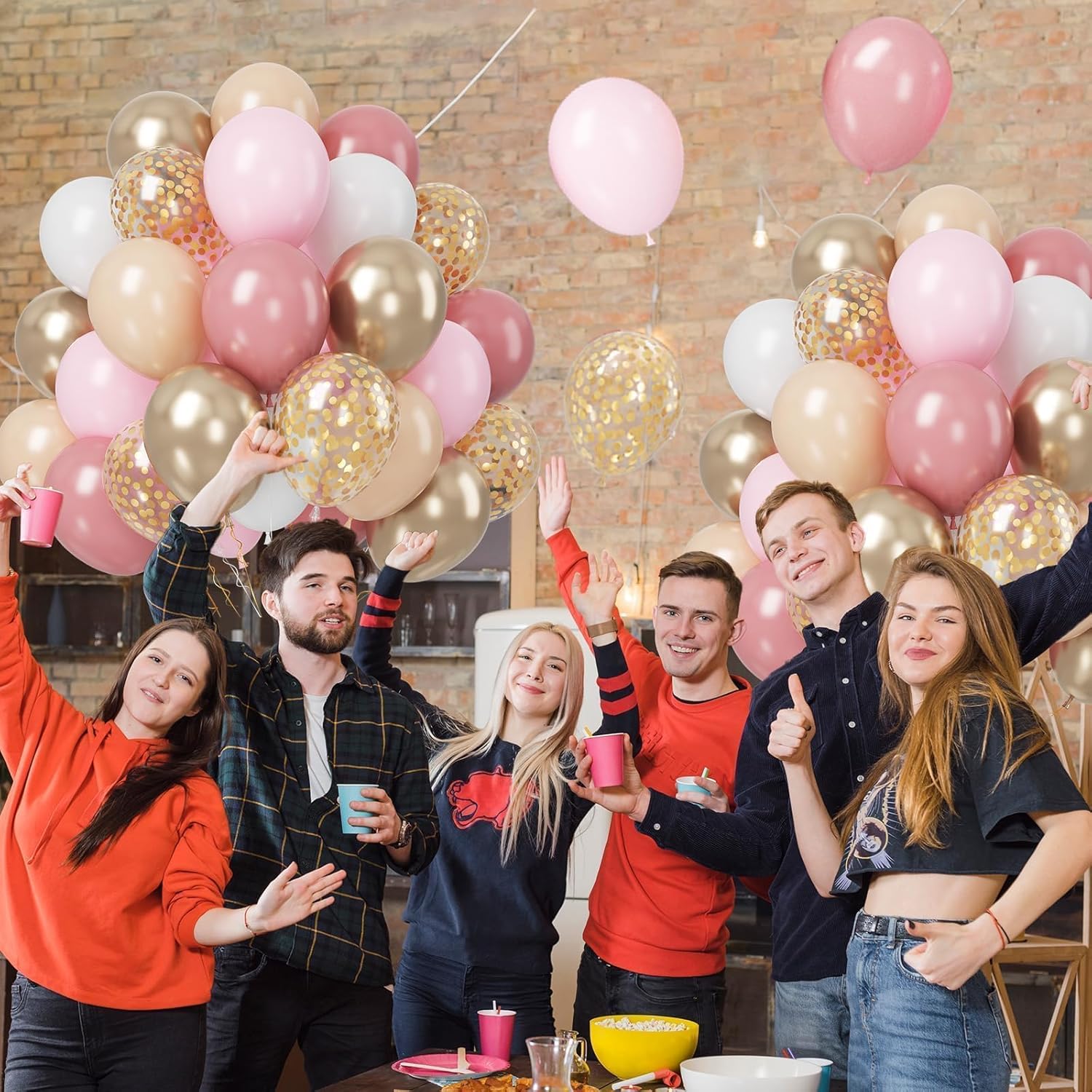 - 【WHAT YOU WILL GET】Our birthday party balloons include 50pcs blush pink balloons, designed to help you create stunning decoration: 10 x retro apricot balloons, 5 x white balloons, 5 x confetti gold ballons, 5 x metallic champagne gold, 10 x light pink balloons, 15 x retro dusty pink balloons, 1 x gold ribbon, and 1 x white ribbon. The size of the balloon is about 12 inches after inflation. The combination of pink and champagne gold can make party or occasion more classy.