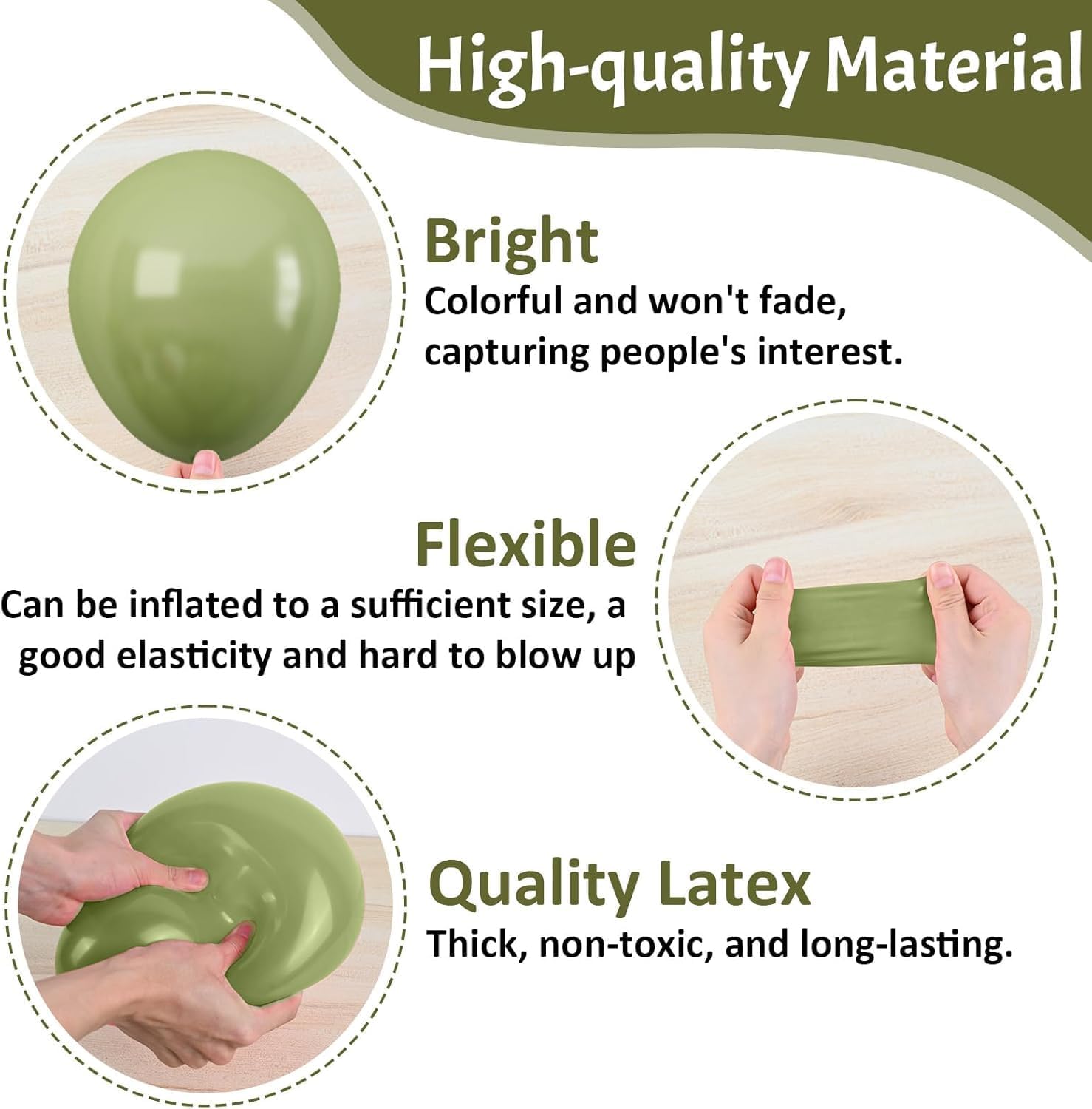 - For Most Scenarios - Both graduation, baby shower, kid's birthday parties, it is easy to embellish door frames, doorways, hallways, ceilings, walls or other ideal places. mattee green gold sand white latex balloons are overflowing with elegance and joy, bringing a different atmosphere to anniversaries, weddings, and more.