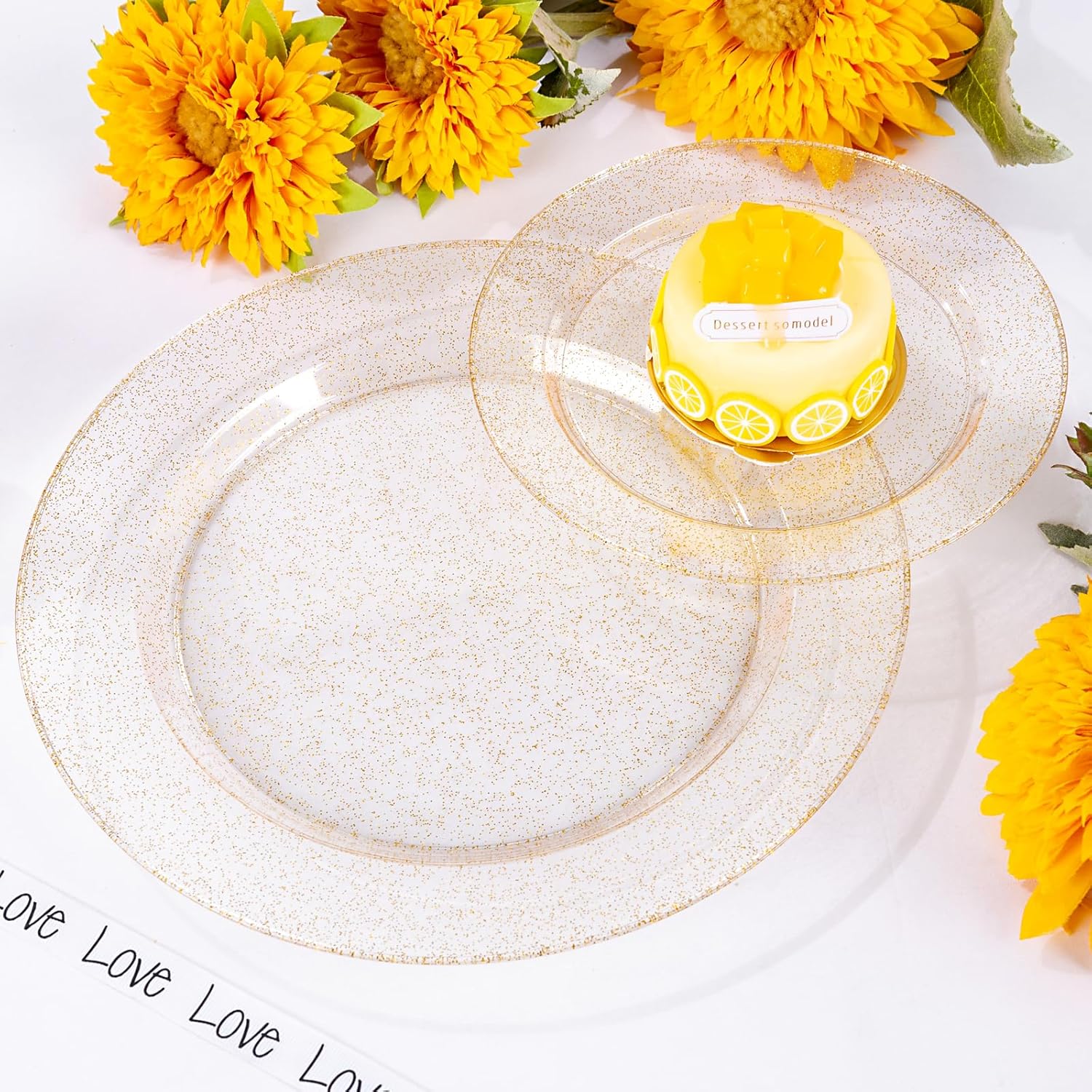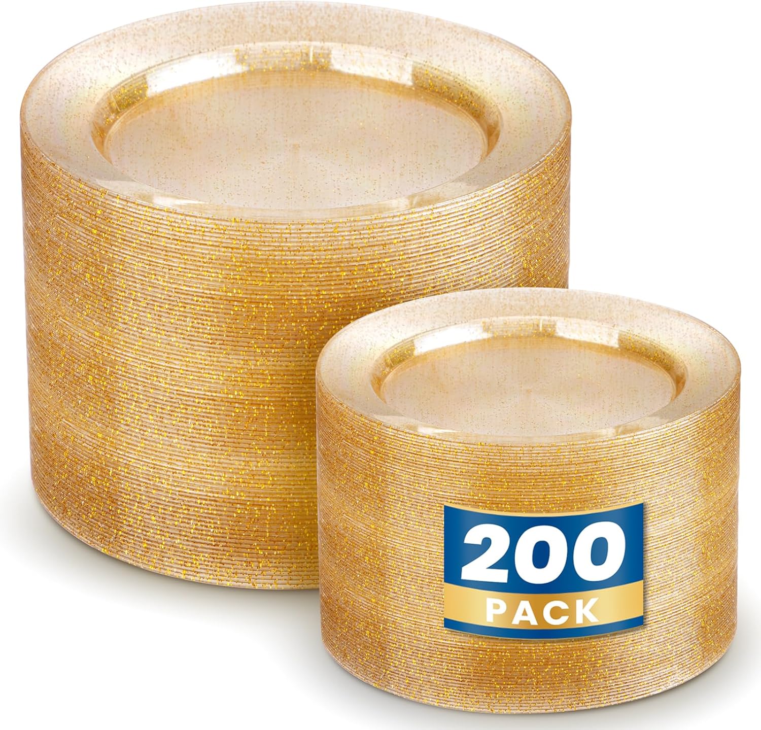 WDF 200PCS Gold Plastic Plates - Gold Glitter Plastic Plates - Heavy Duty Gold Glitter Disposable Plates - Include 100 Dinner Plates 10" and 100 Dessert Plate 7" for Parties/Wedding