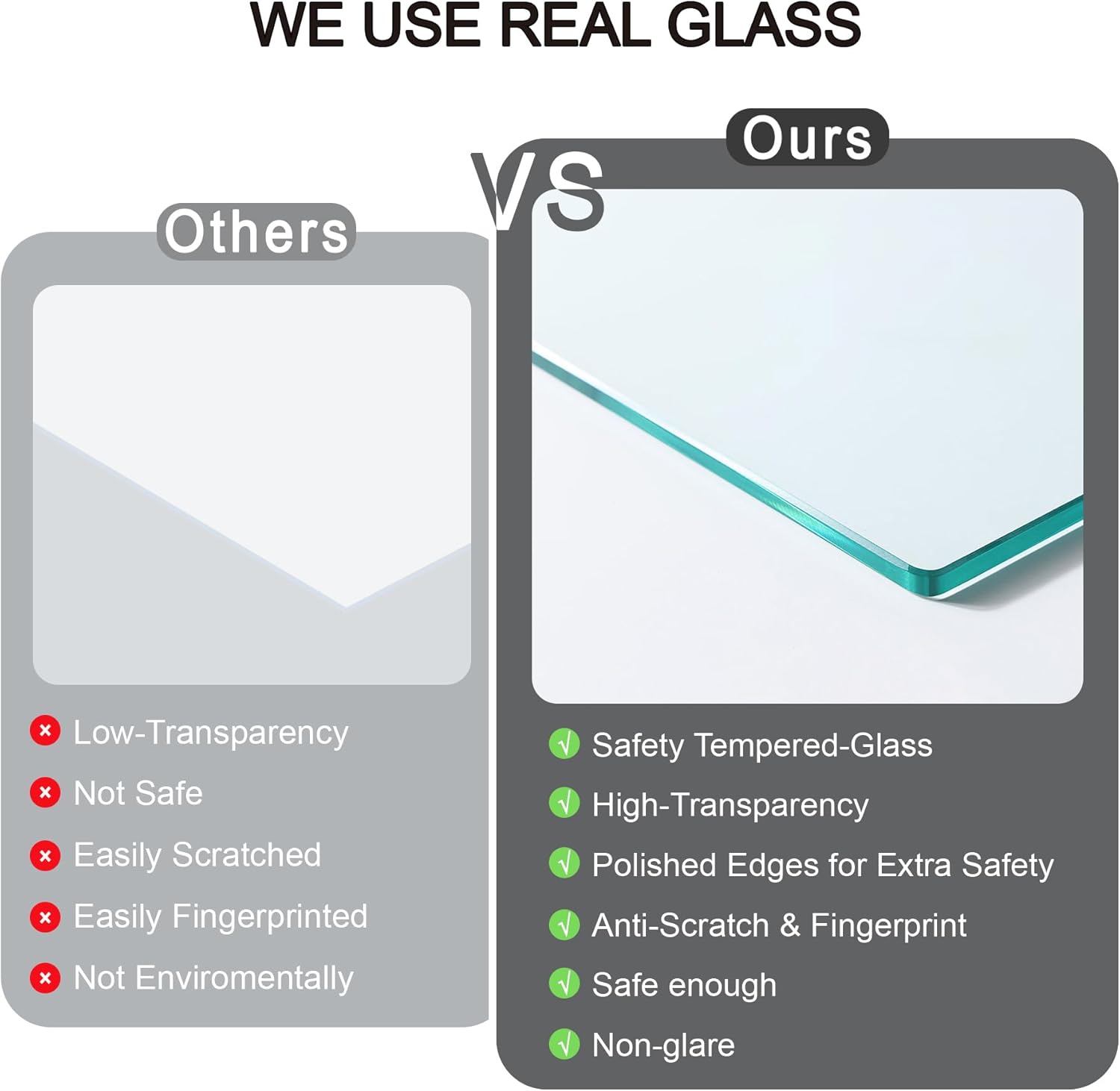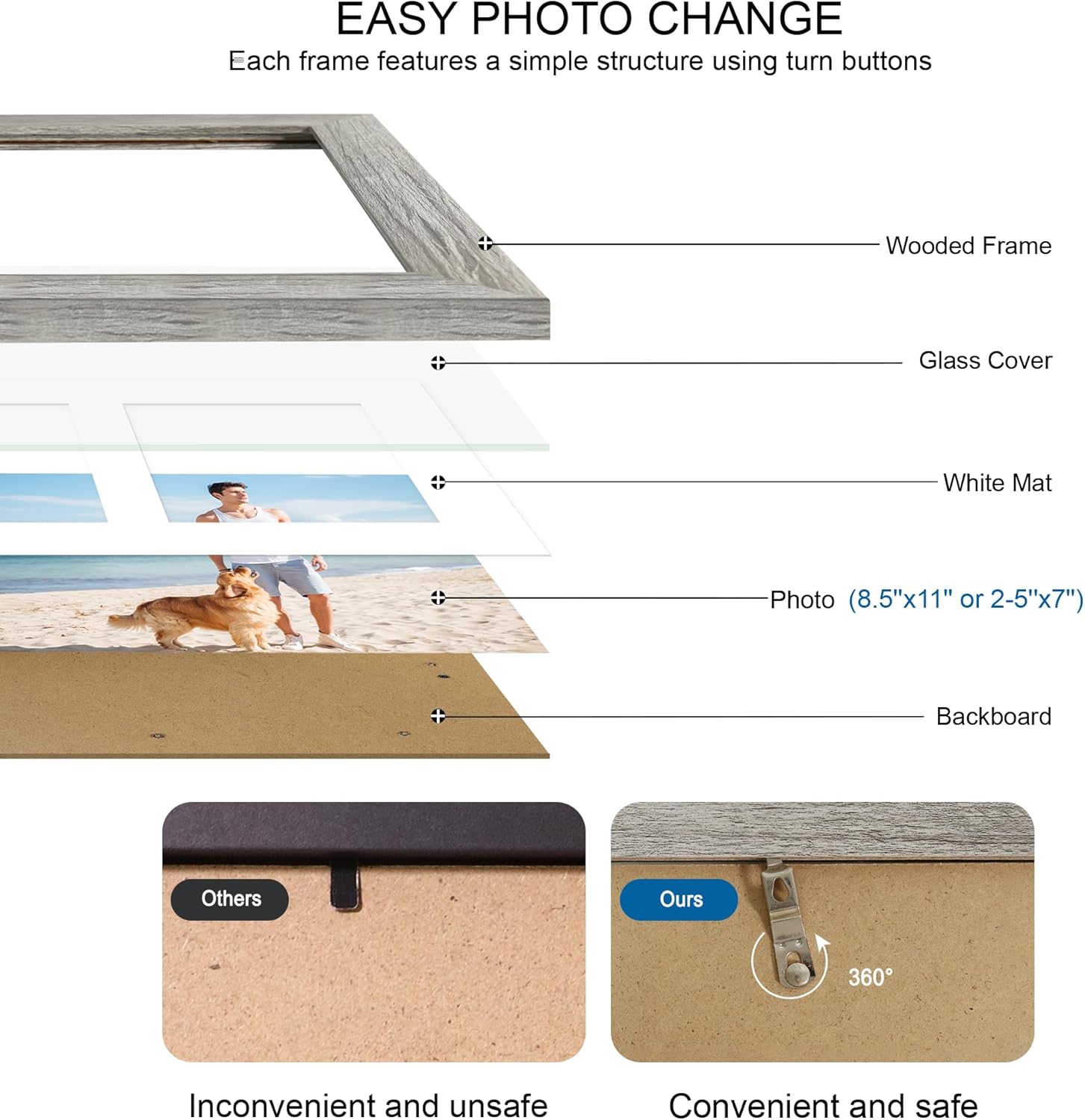 - Rustic Wood and Glass - The 8.5x11 collage picture frames made of durable MDF wood compared to other flimsy PS or plastics frames. we use tempered glass is an exceptional alternative to plexiglass, eliminating the inconveniences of bending, reflection, fragility, and susceptibility to scratches. Its edges are meticulously polished, ensuring your safety and shielding you from the harm caused by sharp glass edges.