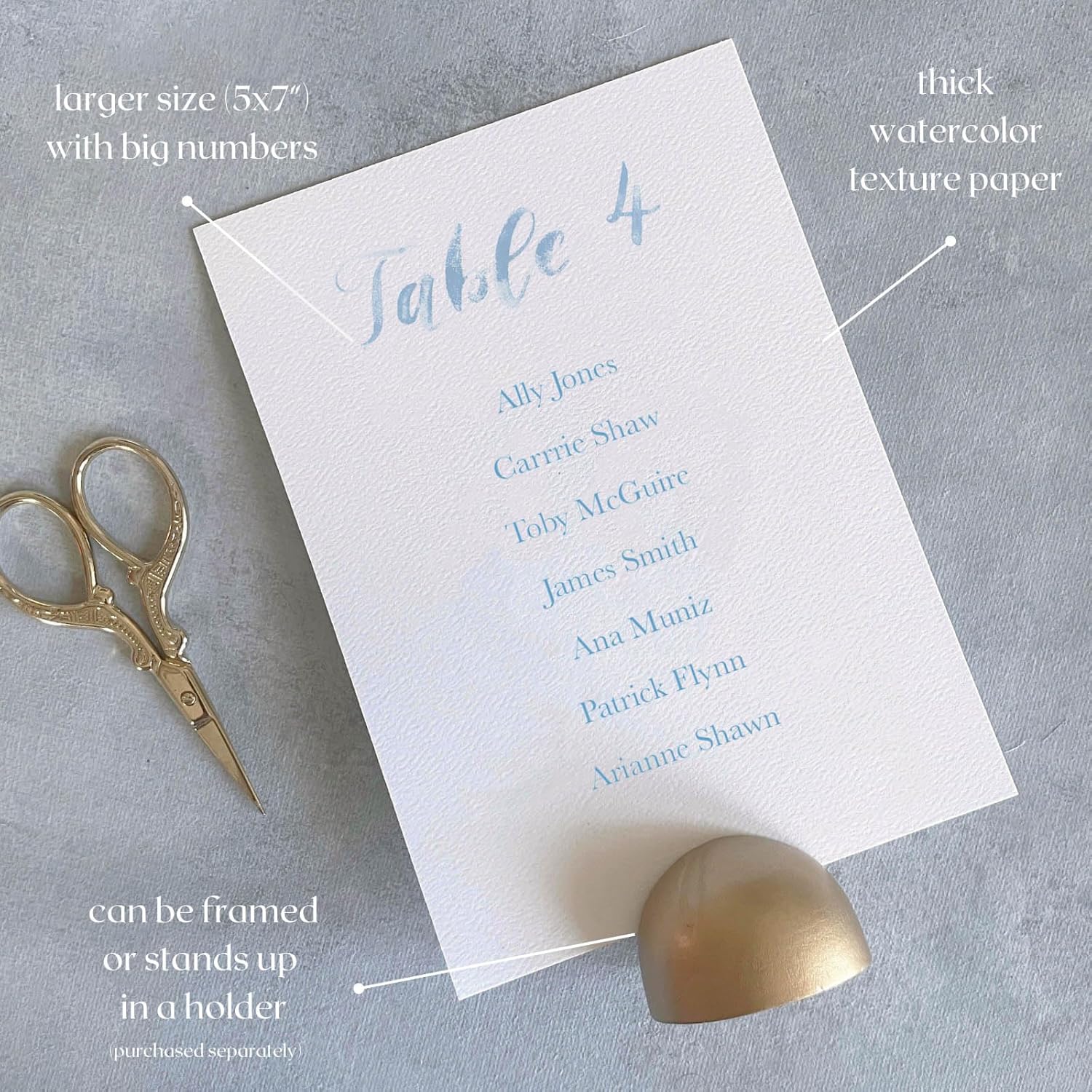 - These 5 x 7 " white and light blue table seating cards are larger than standard size 4x6" table numbers so your guests can see the large numbers and names with ease.