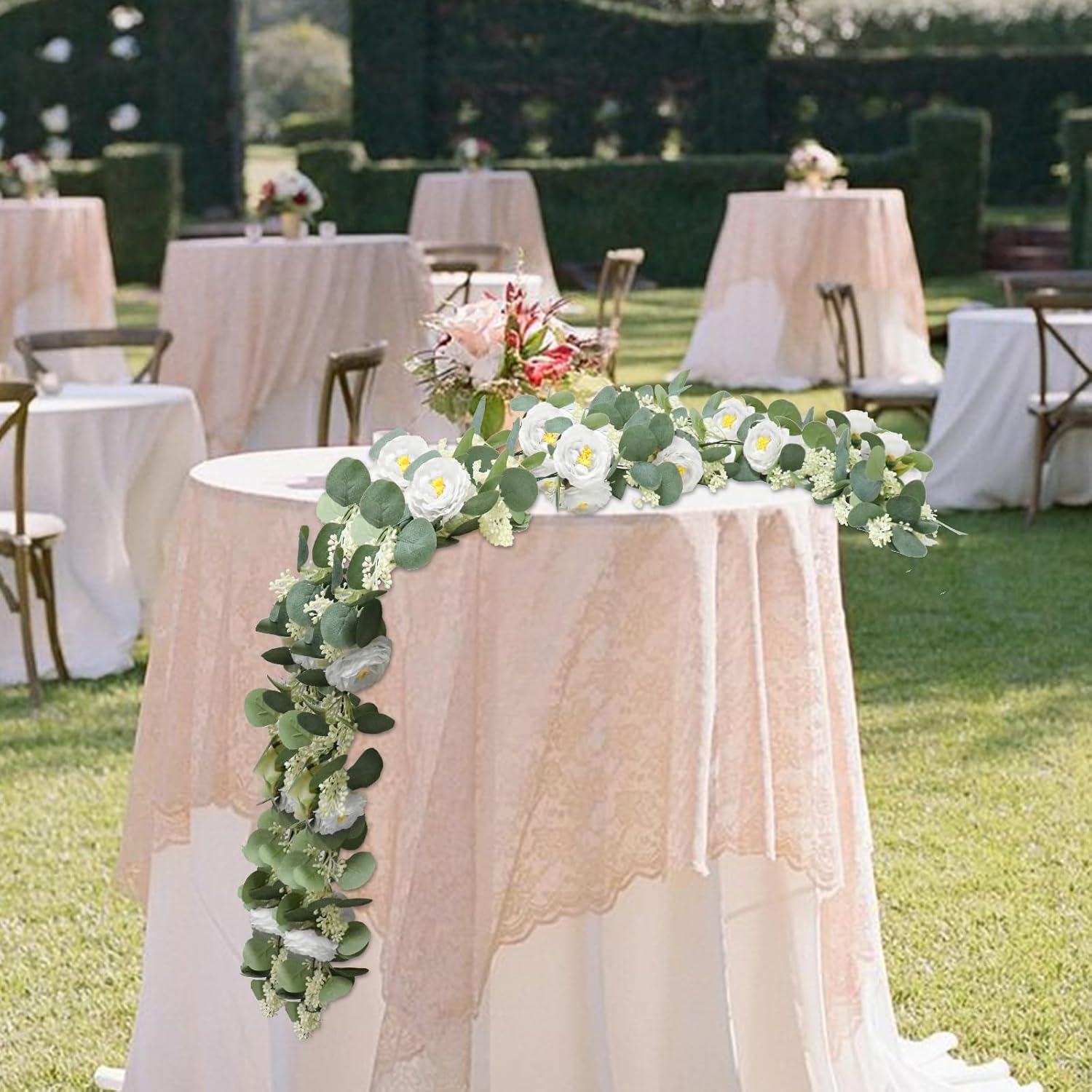 - 🍀🍀【Rose Garland Decor】: The handmade artificial Eucalyptus garland decorations are deal for any wedding or home decoration, such as bedrooms, living rooms, dining table, arches, chairs, backgrounds, corridors, backgrounds, hung on both sides of doors or wedding arches etc. DIY event center. Whether you want to create a romantic atmosphere or add beauty to your life, this fake rose flower vine can blend perfectly.