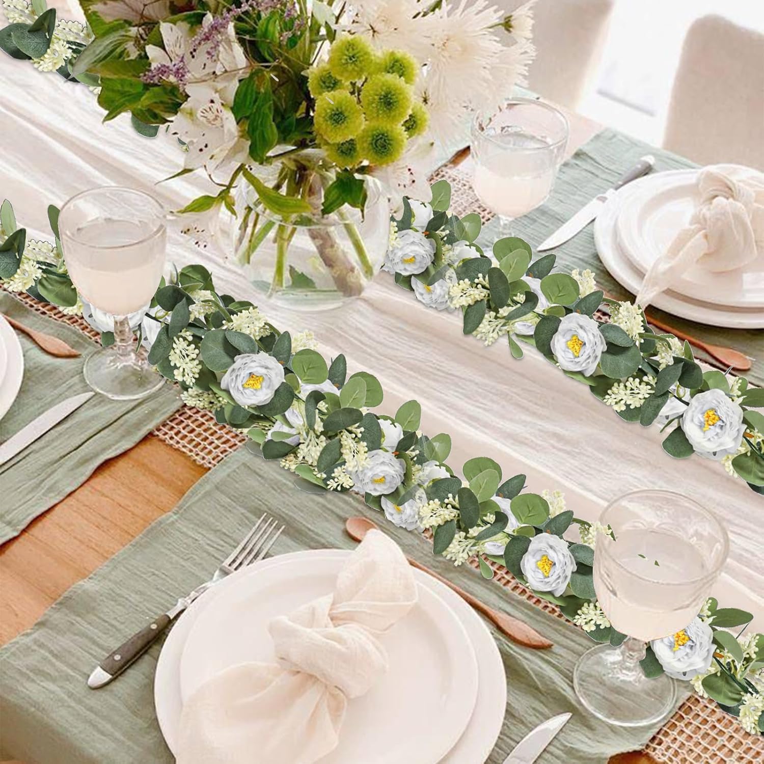 - 🌼🌼【Package】: Every pack include 2 pcs camellia eucalyptus garland with 8 white roses, eucalyptus leaves, seeds and white gypsophila. There are also many small plastic rings distributed on the vine for easy hanging You can easily trim or bend the shape according to your own preferences and decorative needs.