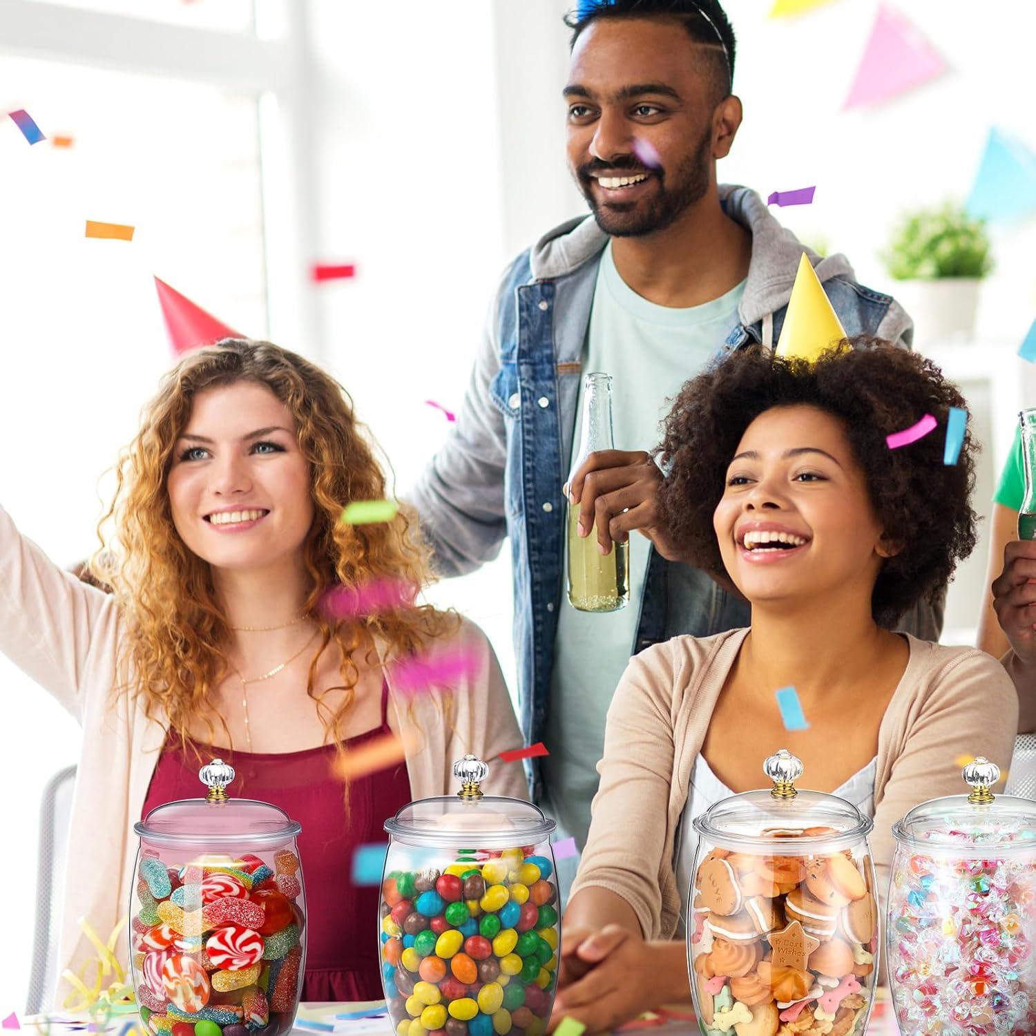- Size and Capacity: the brilliant design of these plastic candy jars with lids boasts a size of about 5.31 x 6.3 inches/ 13.5 x 16 cm (excluding lid height) and an expanded height of about 8.66 inches/ 22 cm when the lid is incorporated; This space saving feature enables you to store up to 1/3 gallon/ 42 oz of your favorite sweets or snacks, fitting well on your kitchen counter or dining table