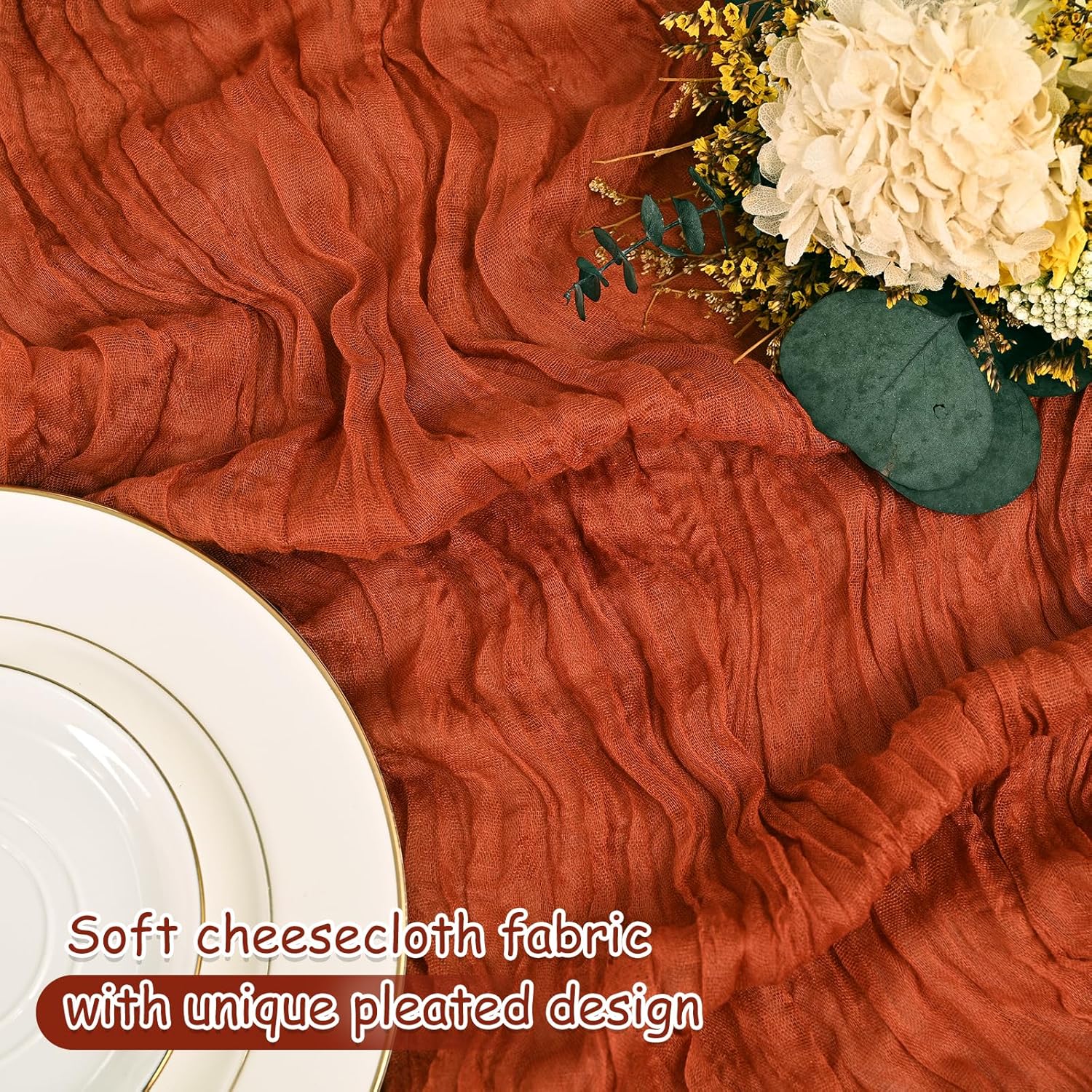 - 【PACKAGE INCLUDES】:You will receive 12 pieces terracotta cheesecloth table runner.The size of each terracotta table runner is about 20 x 120 inches/10ft.Which is enough to decorate most tables and suitable for wedding party birthday bridal baby shower.This gauze table runner will bring a romantic atmosphere for your any event.