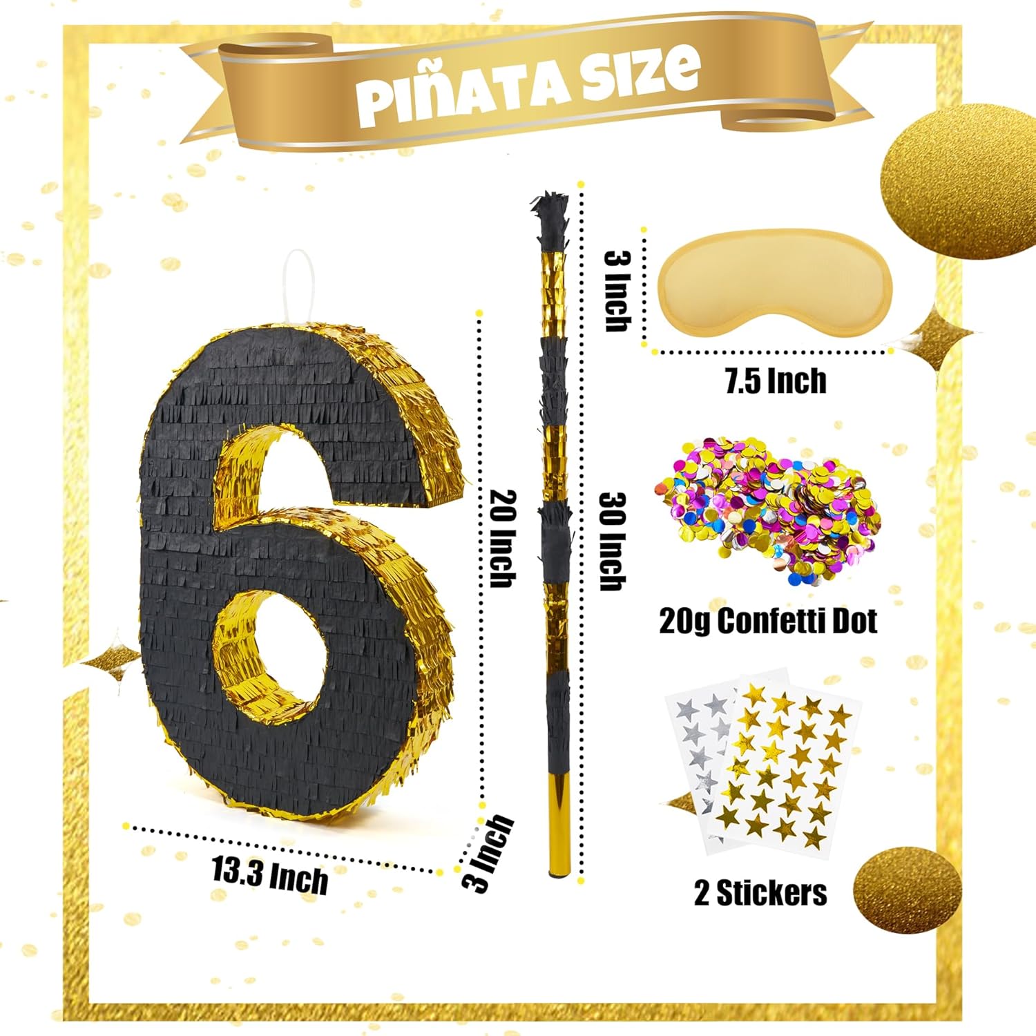 PCFING 20 Inch Number 6 Piñata Gold Black with 30 Inch Piñata Stick Blindfold Confetti for Man Women Boys Girls Birthday Party Decorations, Anniversary Celebration, Fiesta
