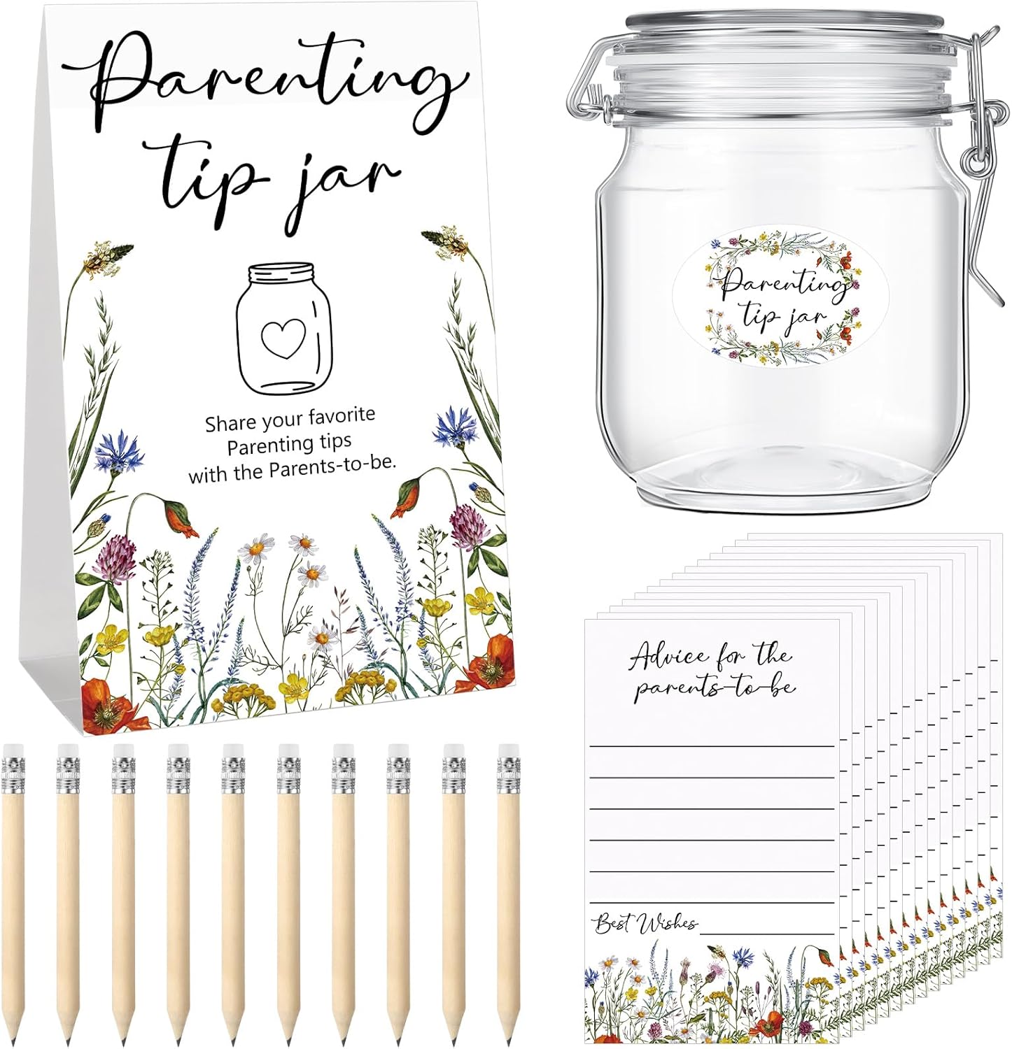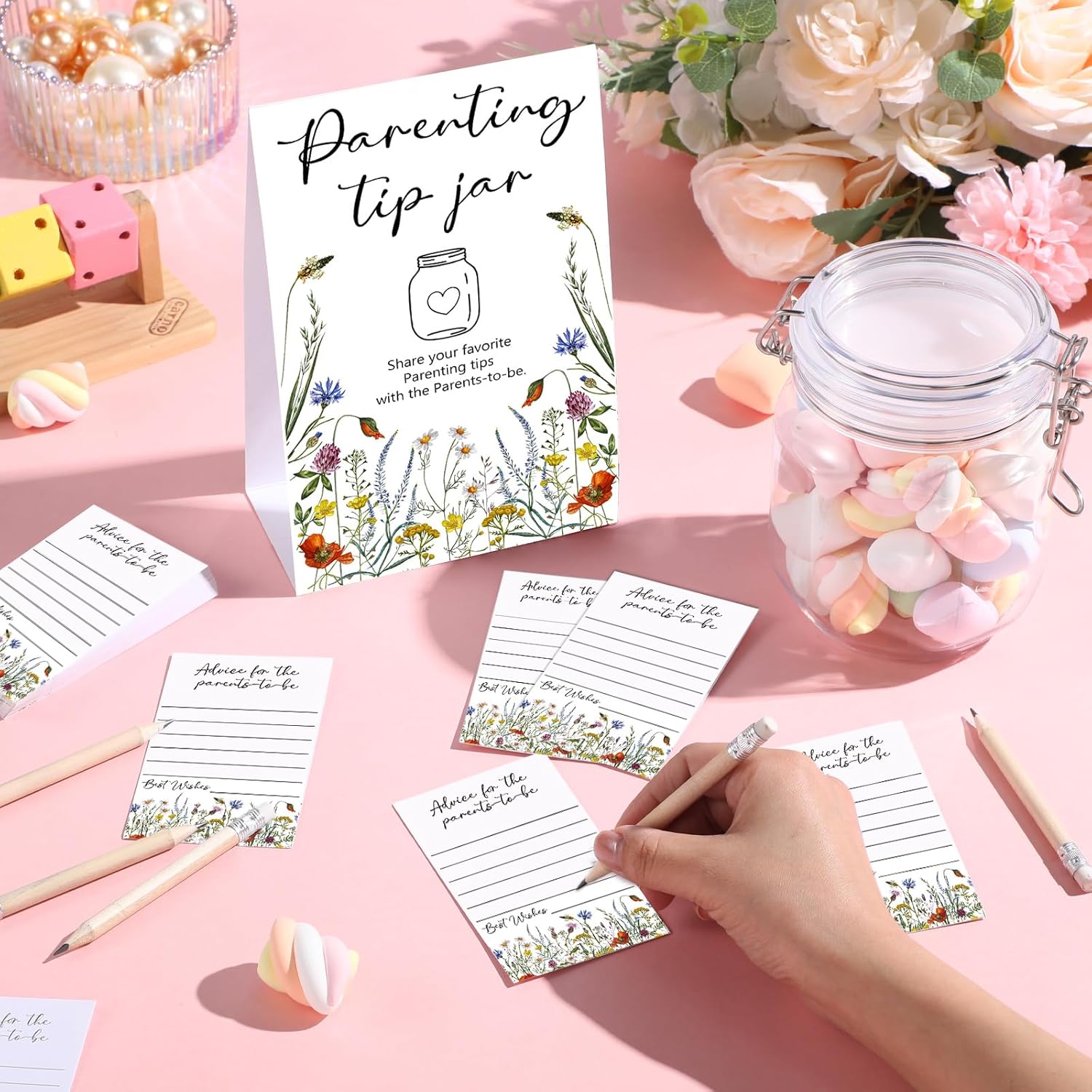 Roowest Baby Shower to Baby Advice Cards for New Parents to Be - Tip Jar Sign for New Parents 60 Parenting Advice Cards 10 HB Pencils 2 Cute Stickers 1 Pet Bottle for Guests Games(Wild Flower)