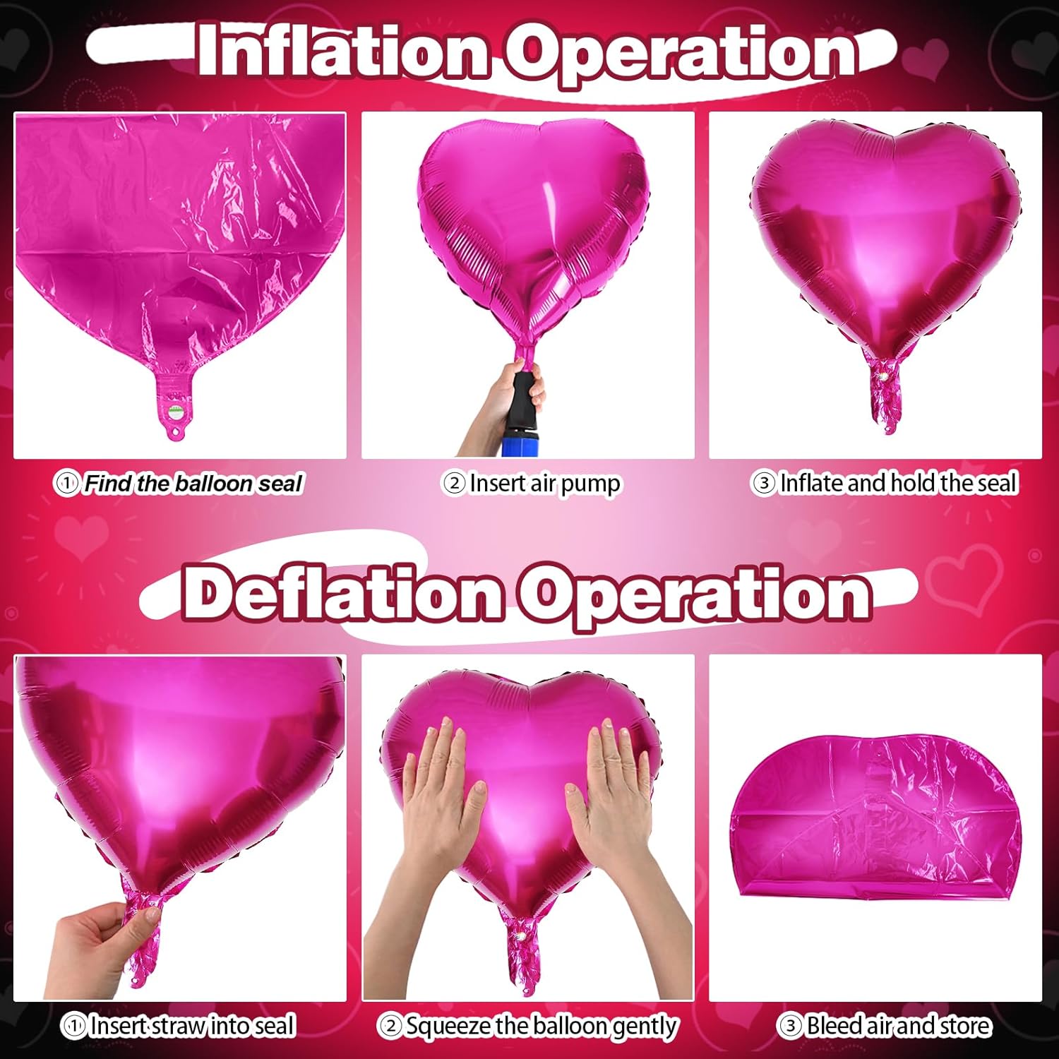 - Easy to Use: The heart foil can inflate with helium or air, can be self-sealed. It is recommended to inflate to 80%-85% to prevent the balloon from bursting. Inflating with helium makes them float, enhancing the effect even more