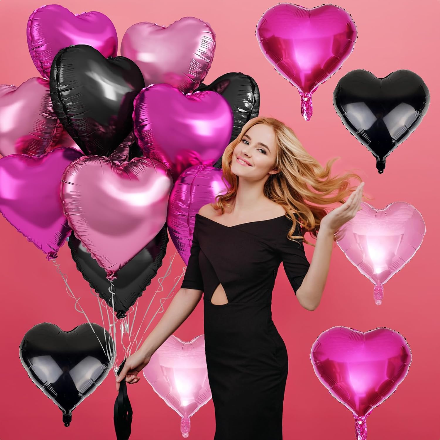 - Black Light Pink Heart Balloons: 12 Packs 18 inch foil balloons. Included 4pcs matte black foil balloons, 4pcs hot pink foil balloons, 4pcs baby pink foil balloons and 1pc ribbons. Hearts foil balloons are the optimal choice for any party occasion