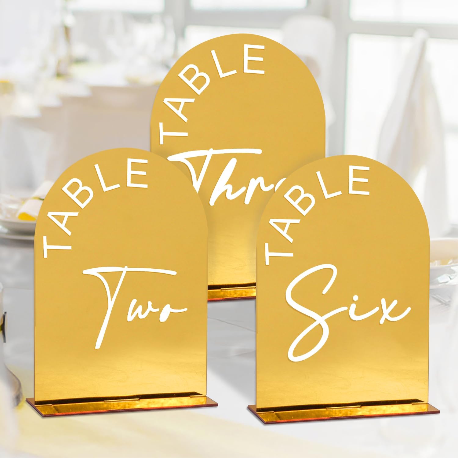 Gold Mirror Arch Wedding Table Numbers 1-30 with Stands, 5x7 Inch Acrylic Arch Sign with Holder for Wedding Reception Table Centerpiece Decoration(Gold Mirror)