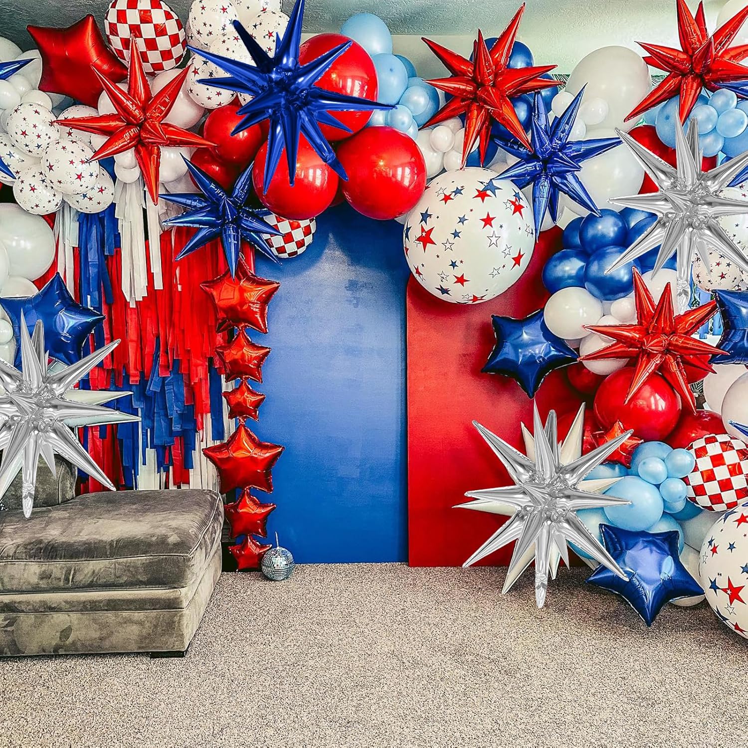 Red Blue Silver Star Balloons,9Pcs 22Inch Blue Red Silver Explosion Spike Cone Helium Polyester Film Star Foil Balloons for Birthday Anniversary Baby Shower 4th of July Disco Party Decorations