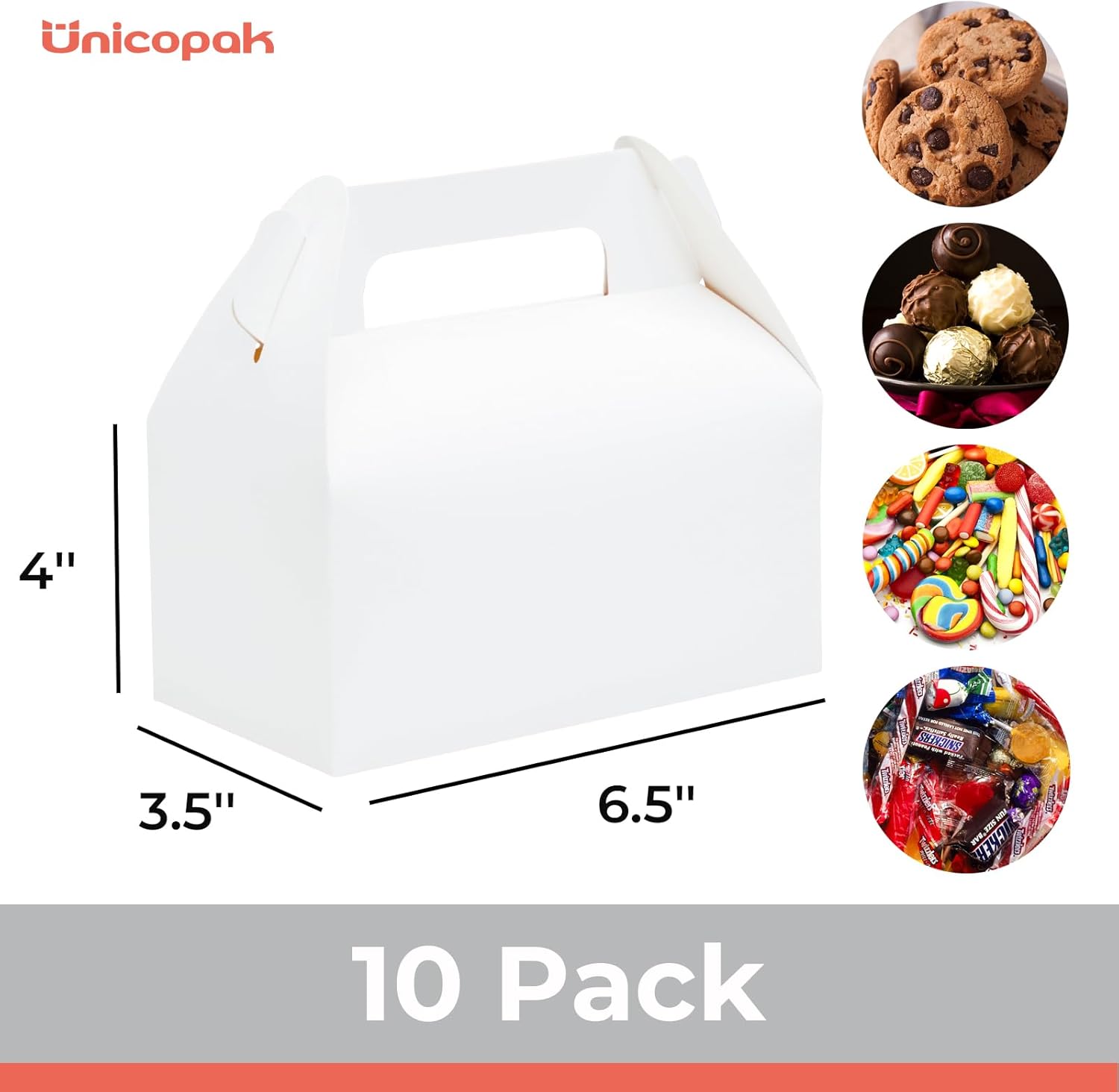 - UnicoPak Party Favor Boxes Value Set. Package includes 10 white gable boxes, each gable box measures 6.5x3.5x4 inches, a versatile size and are commonly used for small to medium-sized gifts, one of the best candy boxes party favors
