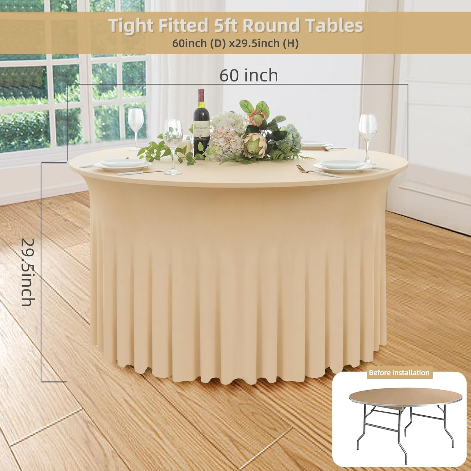 - 【Transforms Your Boring Tables into Eye-catching Round Table Covers】 - The round spandex table covers is with pleats skirt and full cover 5ft/60inch round tables,matching the elegance of table skirt and function of table cloth,add a touch of brightness to your event with our round tablecloths champagne.