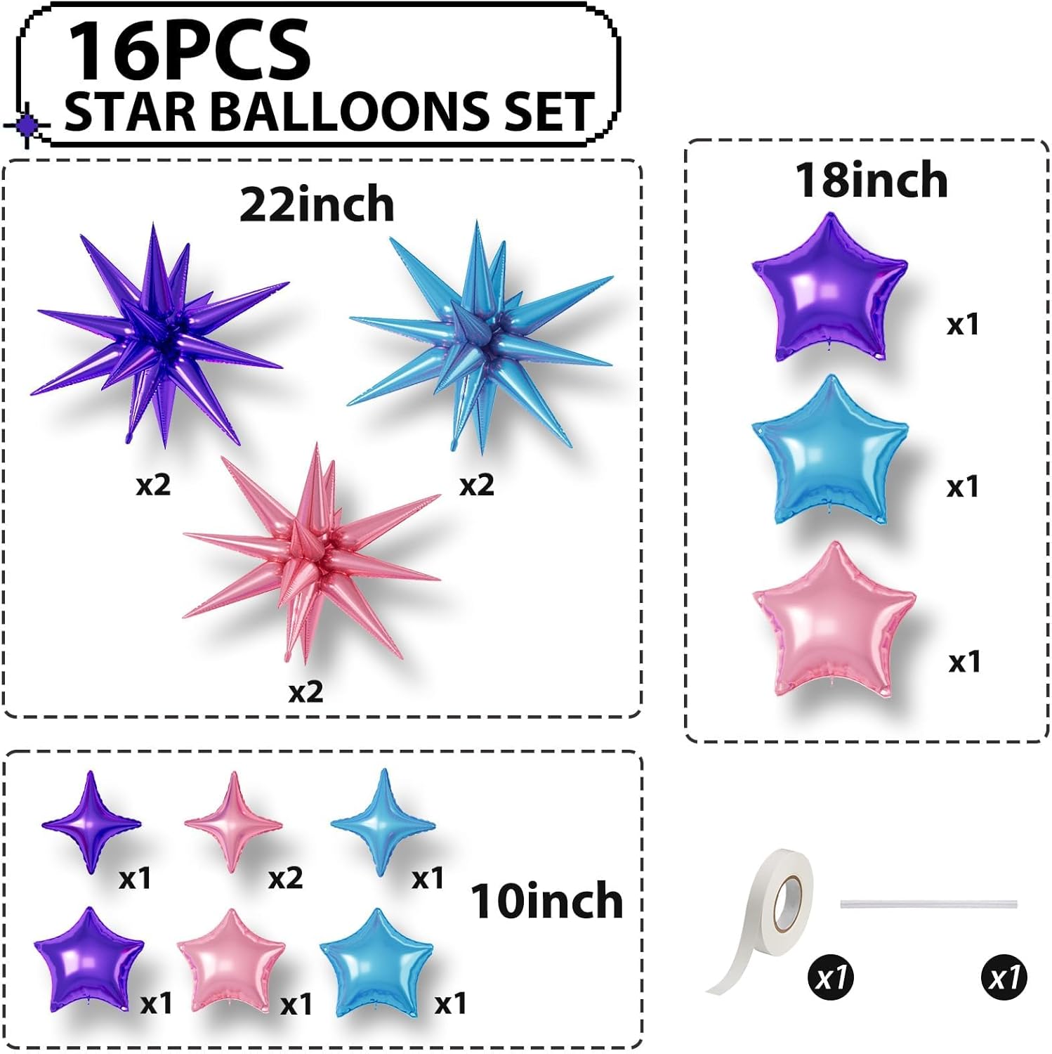 - 【Pink Purple Blue Star Balloons】The package includes:6pcs 22-inch Star-Shape balloons(Pink*2,Purple*2,Light Blue*2), 4pcs 10-inch Four-Pointed Star balloons(Pink*2,Purple*1,Light Blue*1), 3pcs 18-inch Five-Pointed Star balloons(Pink*1,Purple*1,Light Blue*1), 3pcs 10-inch Five-Pointed Star Shape balloons(Pink*1,Purple*1,Light Blue*1),1 dispense and 1 straw. These foil star balloons are Great for birthdays, weddings, baby showers, and engagement parties