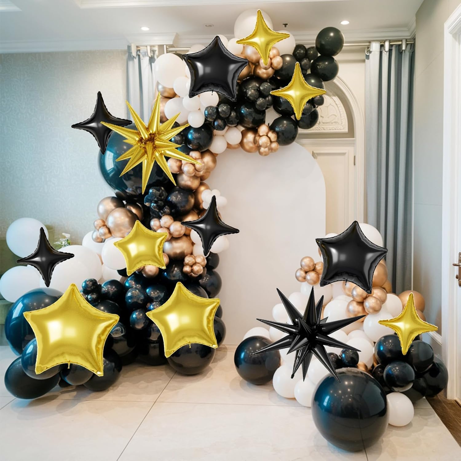 16 Pcs Black Gold Star Balloons, 22/18/10 Inch Foil Balloons, Four-Pointed Balloon for Kids Birthday Anniversary New Year Wedding Baby Shower Party Decorations