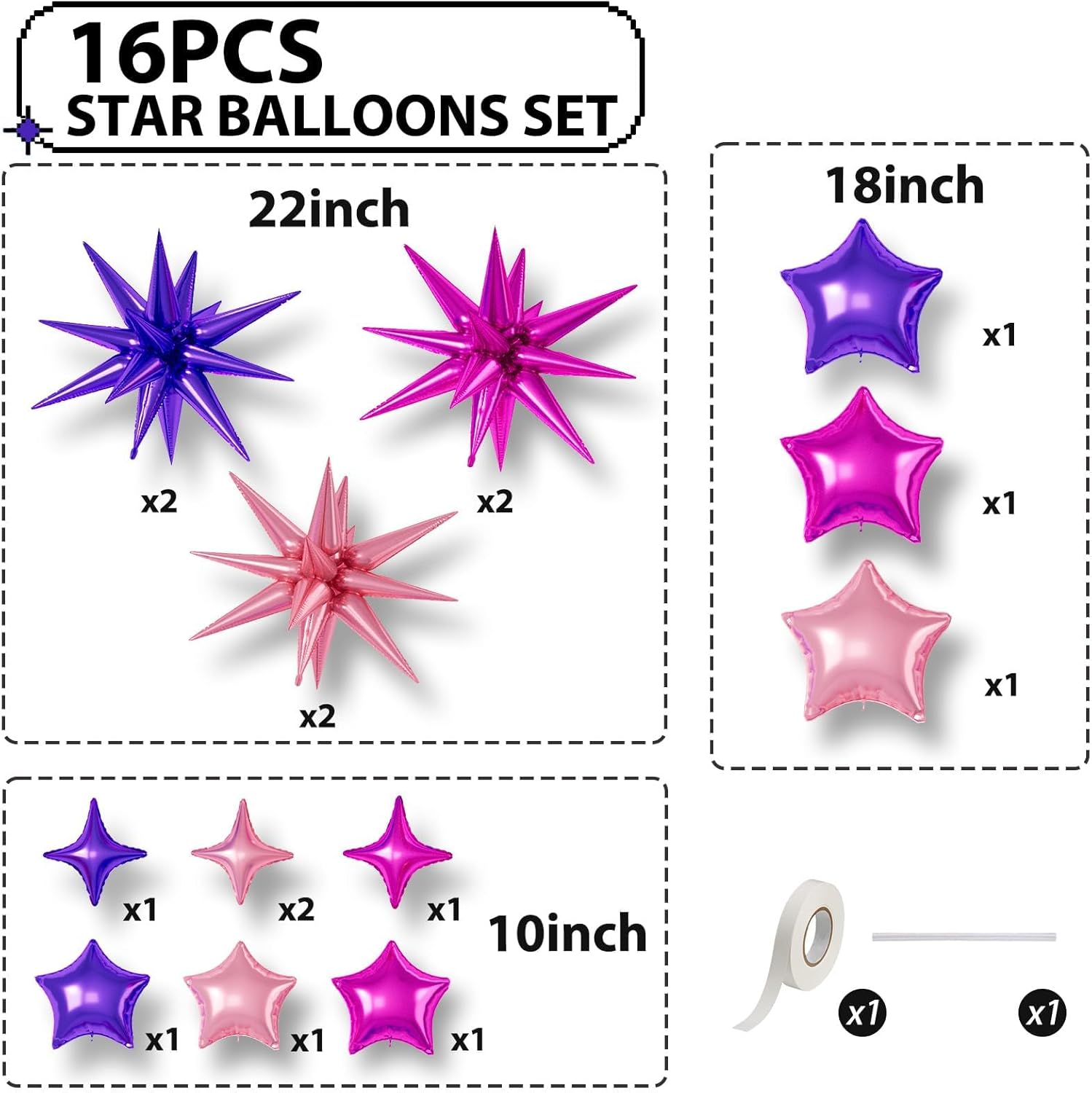 16 Pcs Hot Pink Purple Star Balloons, 22/18/10 Inch Foil Balloons, Four-Pointed Balloon for Girl Princess Birthday Wedding Baby Shower Party Decorations