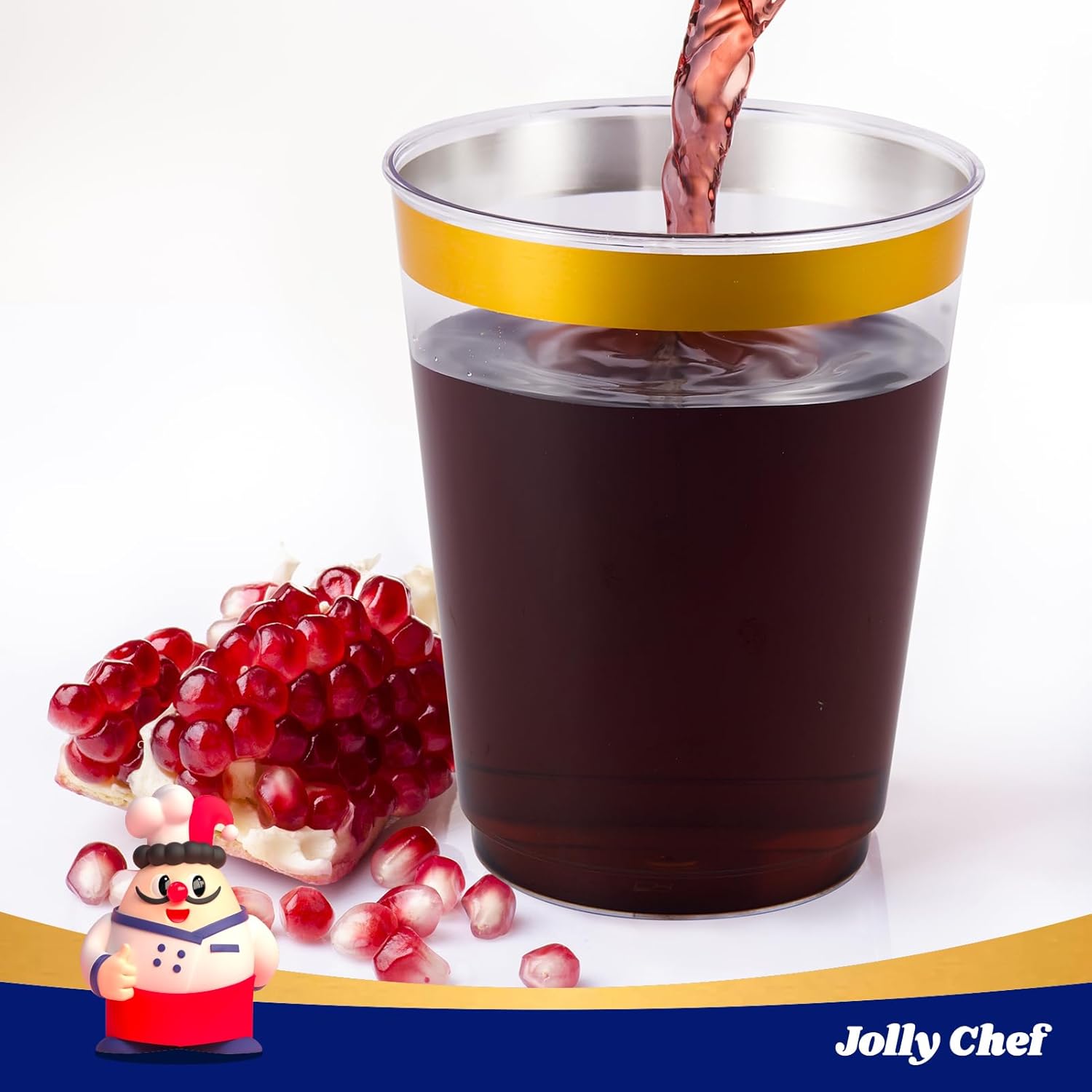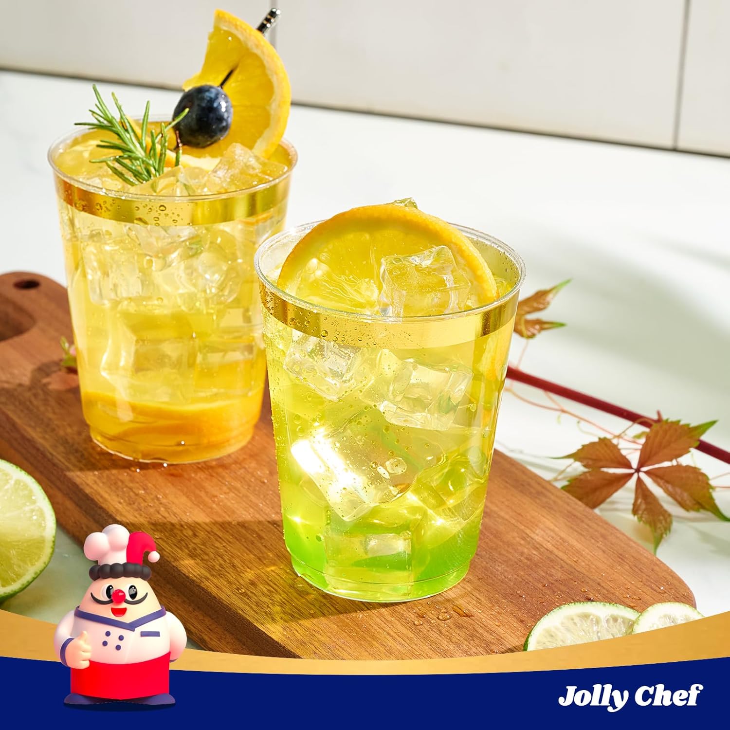 JOLLY CHEF 200 Pack 10 oz Gold Plastic Cups Elegant Gold Rimmed Disposable Cups Heavy-Duty Party Cups for Wedding & Party