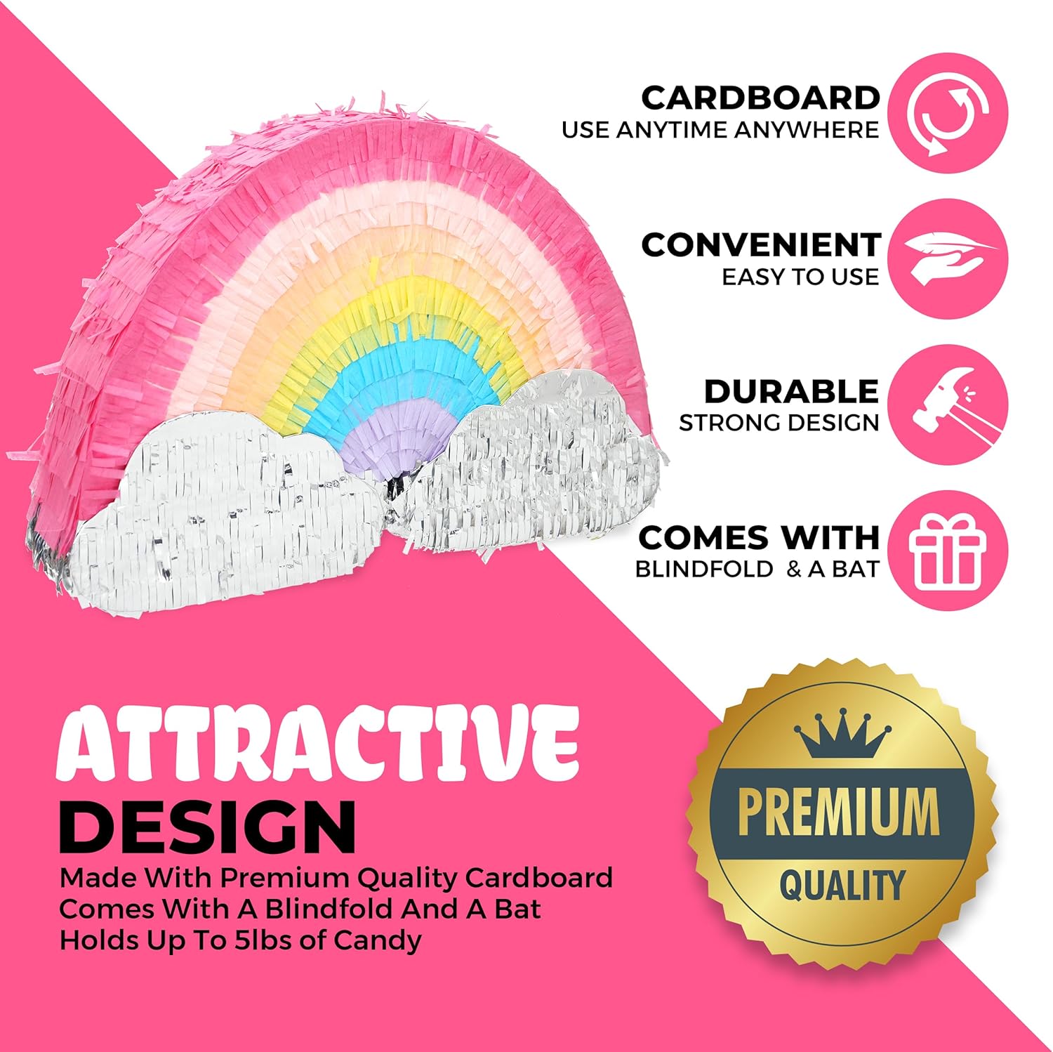 - ❤️【 PREMIUM QUALITY 】- The pinata measures 16.5 x 8.5 x 3.5 inches. Made with high and resistant cardboard. Decorated with crepe paper on bond paper, high strength plastic loop to hang. Premium material ensures its durability and fancy looking. It comes with a blindfold and bat to make more fun.