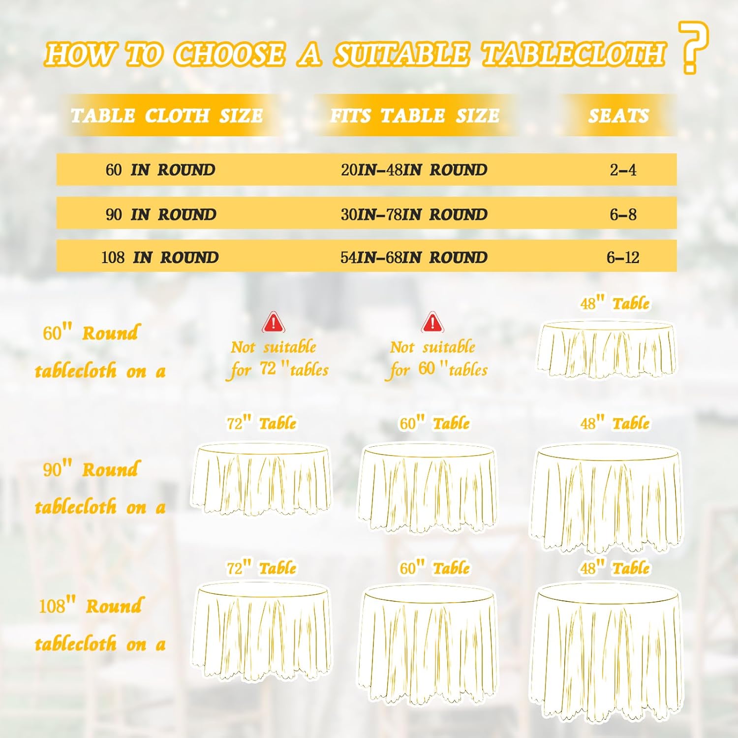 - Widely used scenarios: Round table cloth is suitable for wedding parties, dances, banquet events, birthday parties, restaurant tables, graduation parties, and daily dining tables. It can also be used as decorations for Halloween, Christmas, and Valentine's Day.