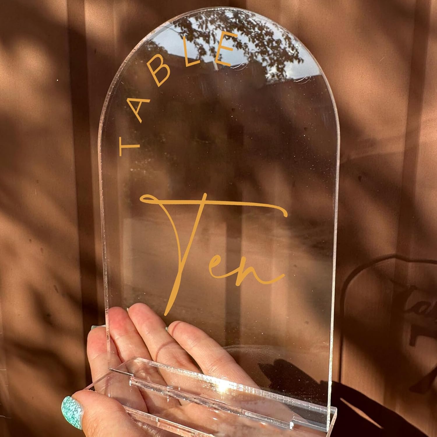 - PACKAGE INCLUDES: 5x7 inch clear and gold acrylic table numbers 1-10 with clear acrylic stand, total 10 sets in one pack. Each clear acrylic arch table numbers Has A Protective Film On Both Sides To Prevent Scratches and when you are ready to use it, you should peel it off.