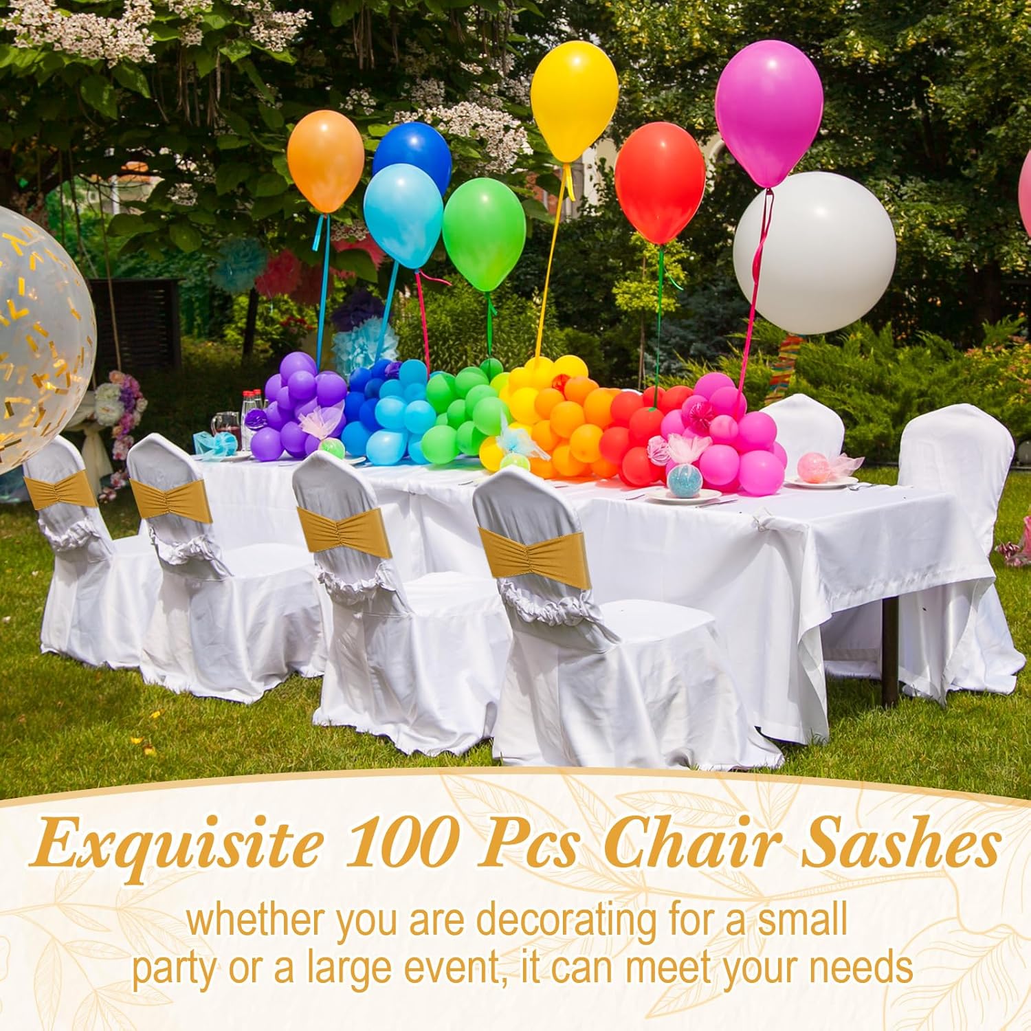 - Sufficient Quantity: you will receive 100 packs of chair sashes in lovely colors; Whether you're decorating for a small party or a large event, the ample quantity meets your needs for setup, replacement, or sharing with others; We've upgraded the chair sashes with a reinforced center spring to better hold their shape and prevent sagging or thread breakage, making them more long-lasting