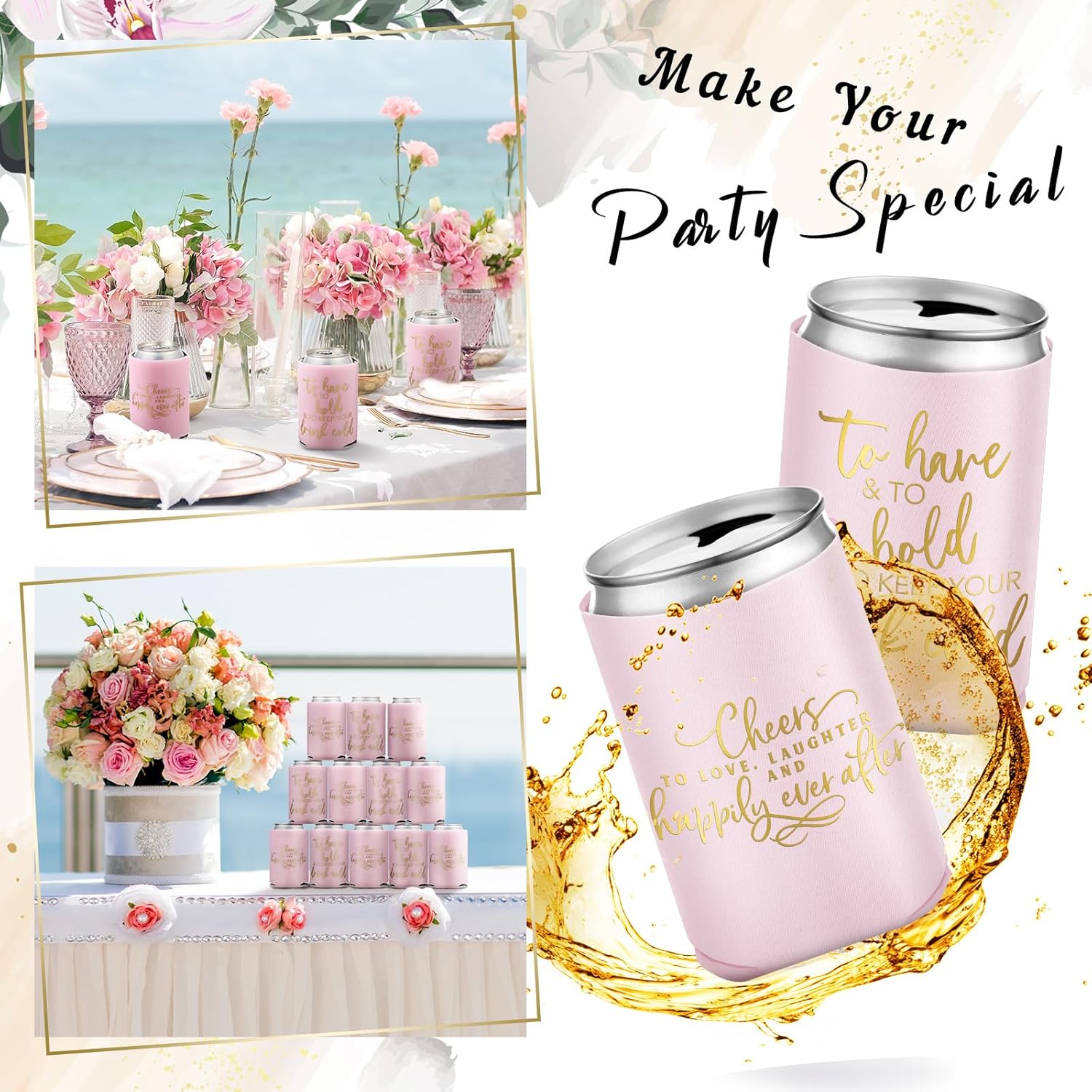 - Satisfying Party Package: our huge package containing 50 pieces of wedding can cooler decorations; Make every drink a celebration with our pink and gold can coolers; They are suited to uplift the atmosphere at weddings, bridal showers, and bachelorette parties