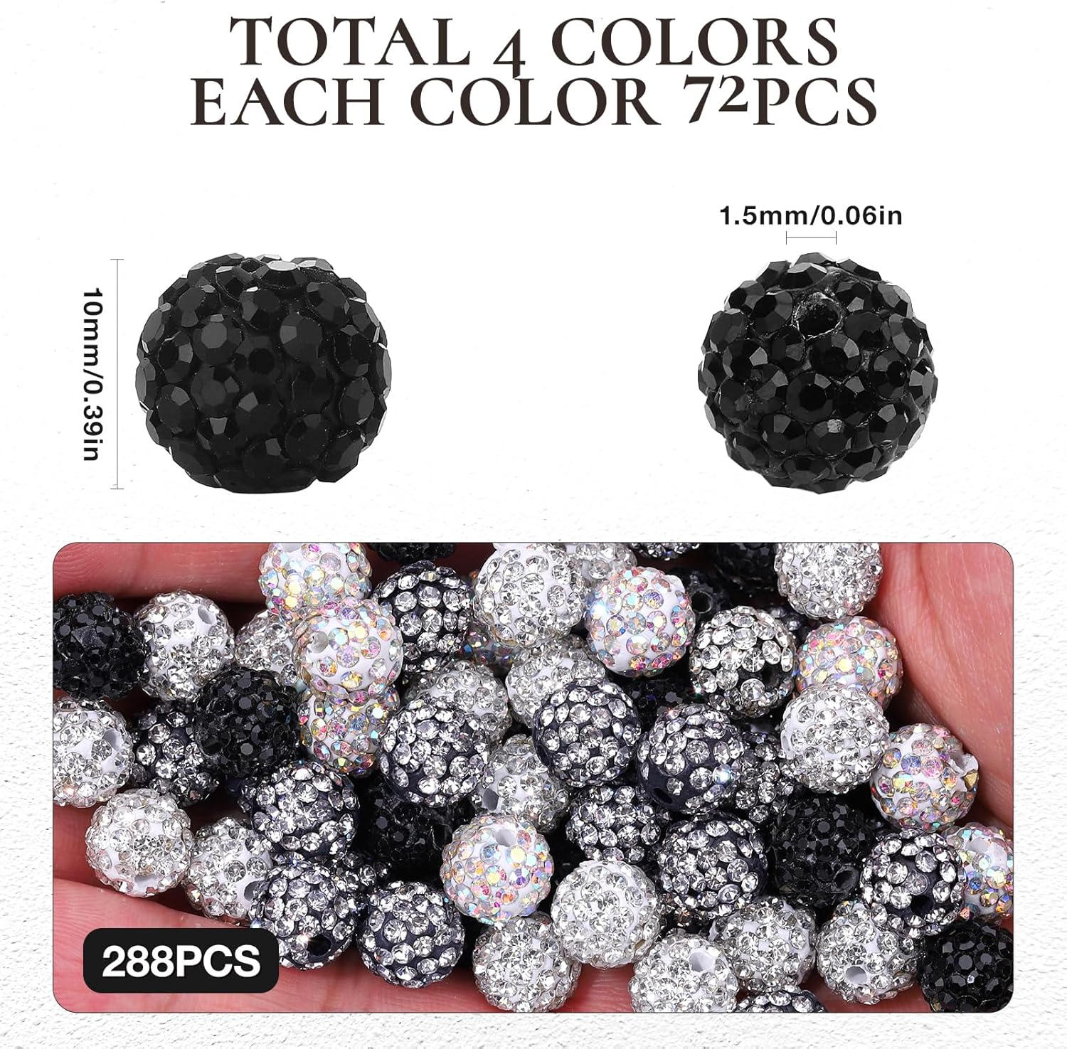 - DIY HANDMADE: Rhinestone clay beads, with a hole of about 1.8 mm and a sphere diameter of 10 mm, are easy-to-string beads and are suitable for most Beads for Crafting jewelry scenes. They can be used for necklaces, baseball friendship bracelets, earrings, and beaded pens Handmade accessories such as keychains can also be matched with other spacer beads for diversified handmade creations