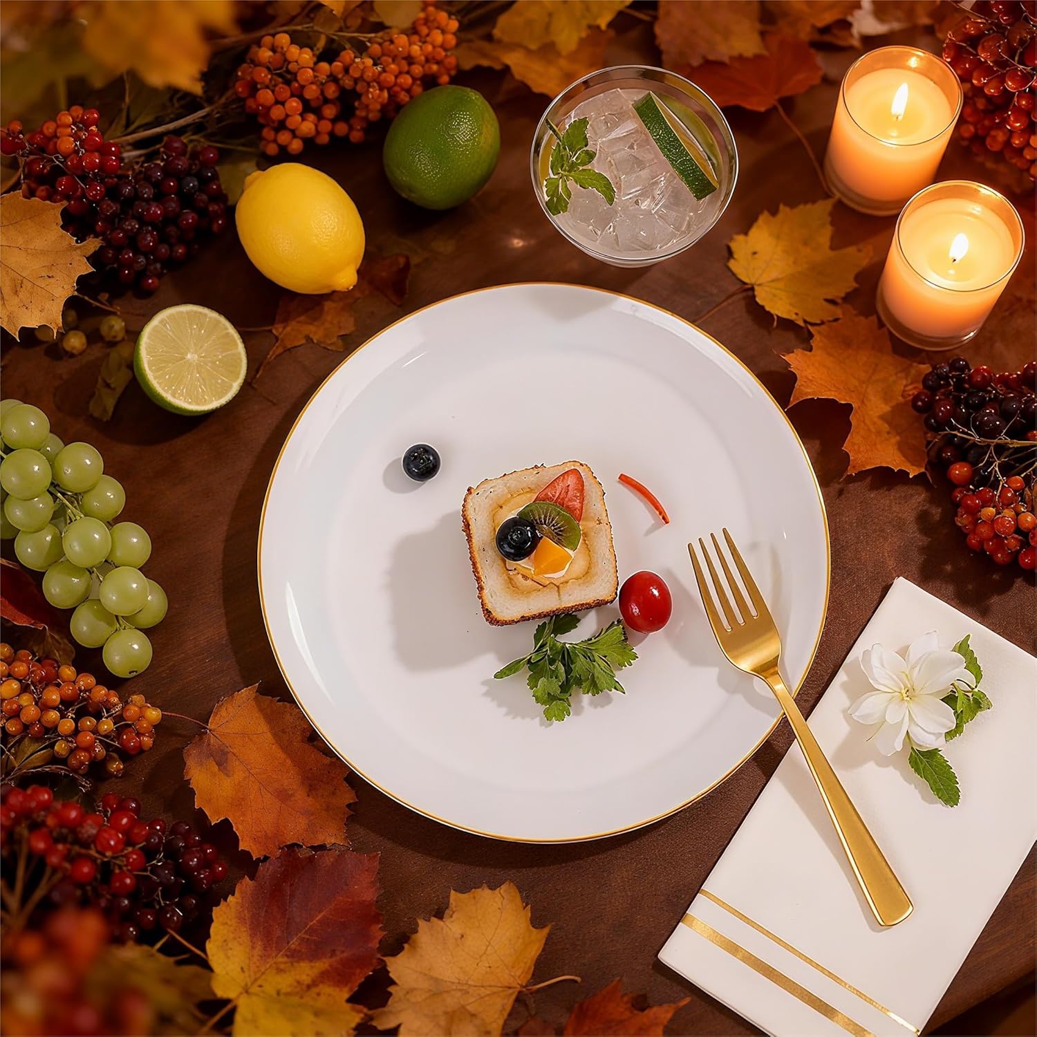 - Elegant White With Gold Rim Design:Classic white plastic plates with gold rim add sophistication to any table.Our gold plates and napkins party supplies versatile for upscale weddings, casual brunches, or holiday gatherings—effortlessly elevates decor without extra cost.