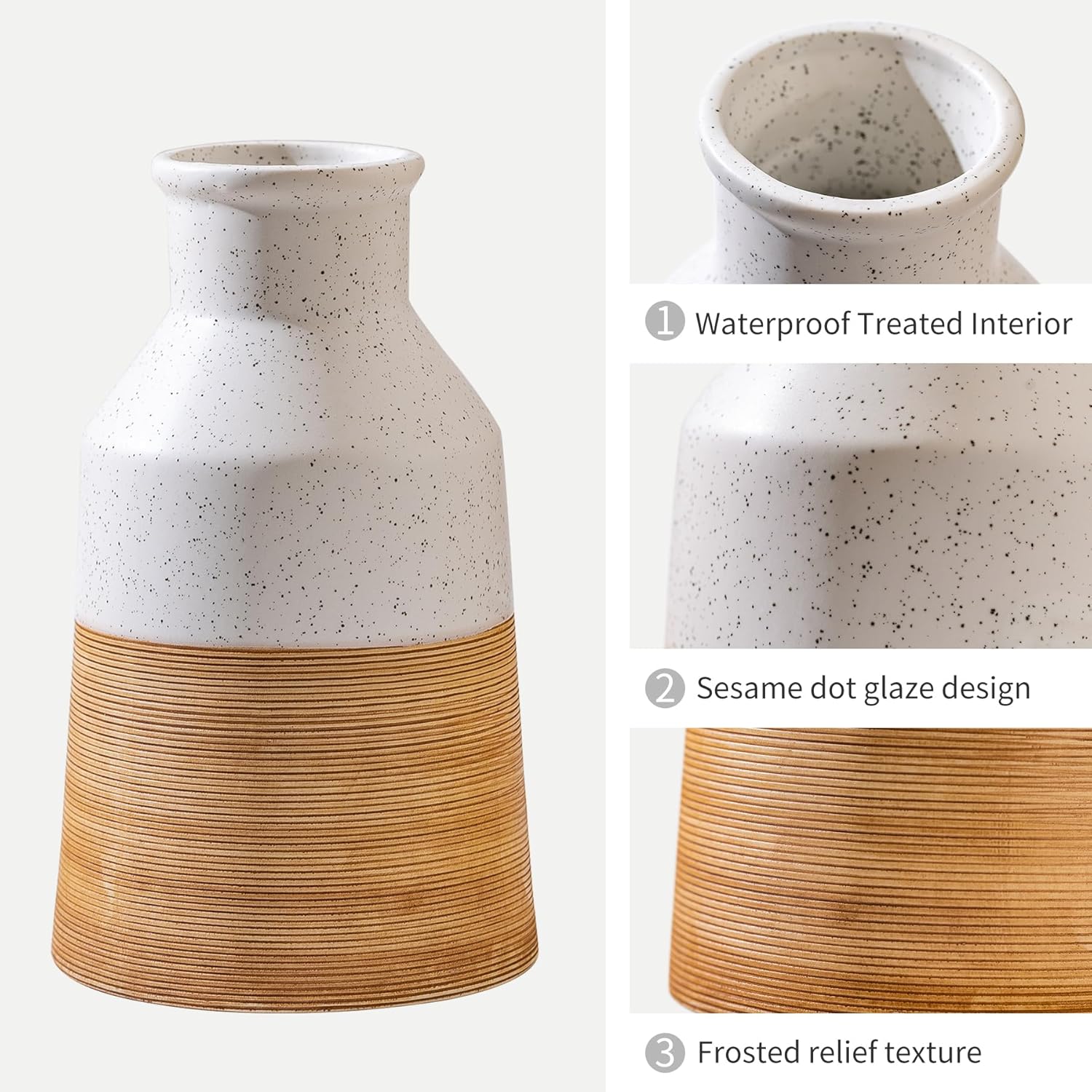 Rustic Farmhouse Flower Ceramic Striped Vase, White and Brown Decorative Ceramic Modern Floral Vase for Bouquet, Cottage Home Core Decor, Tabletop Bedroom Office Bookshelf Living Room Wedding 7.7 Inch