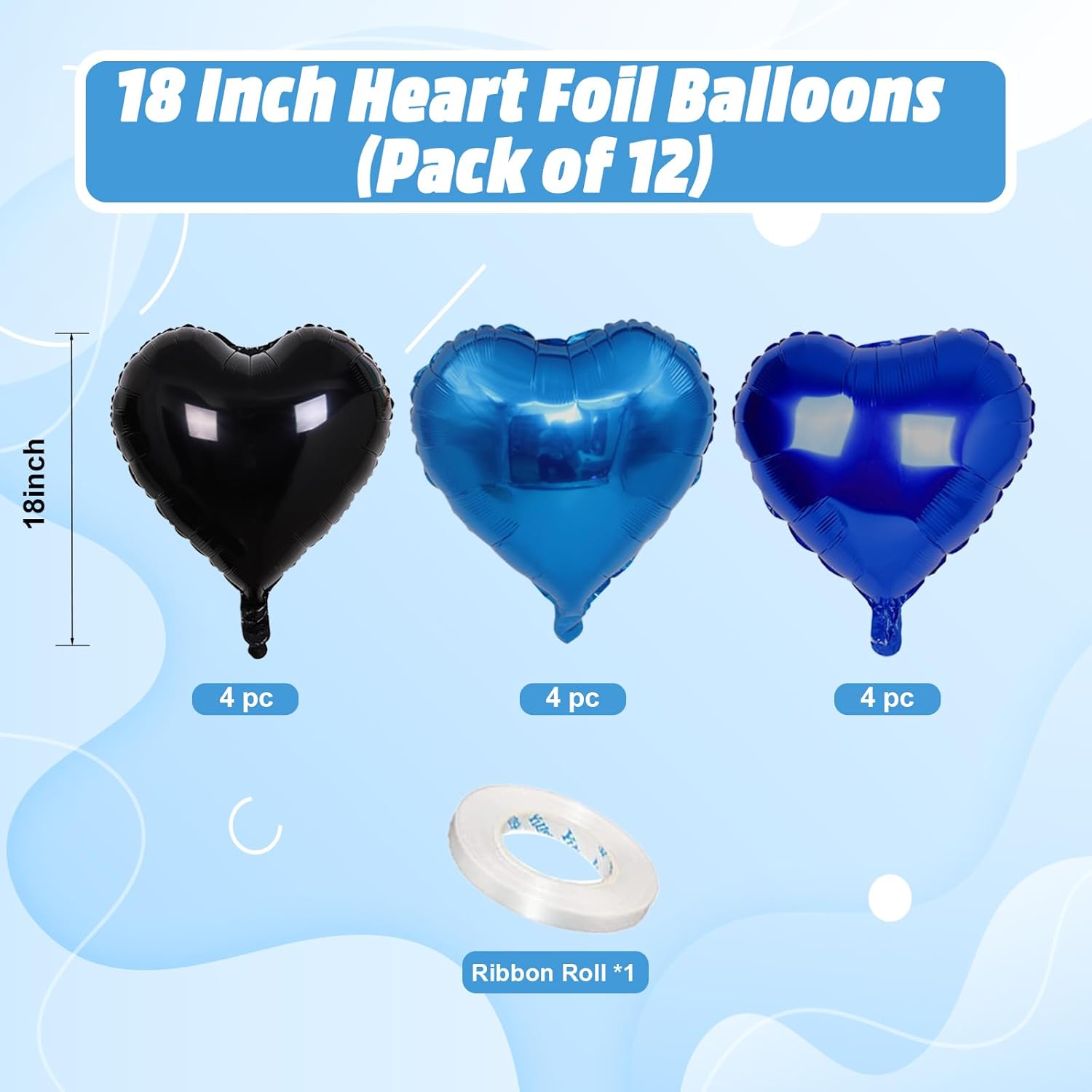 - Charming Blue Black Heart Balloons: Elevate your celebration with our set of 12 heart-shaped black and dark blue balloons, each measuring 18 inches. Accompanied by a ribbon, these balloons are ideal for creating a festive and loving atmosphere at any special event.