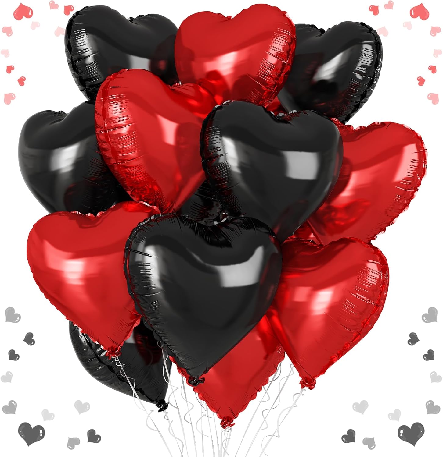 - Charming Red Black Heart Balloons: Elevate your celebration with our set of 12 heart-shaped red and black balloons, each measuring 18 inches. Accompanied by a ribbon, these balloons are ideal for creating a festive and loving atmosphere at any special event.