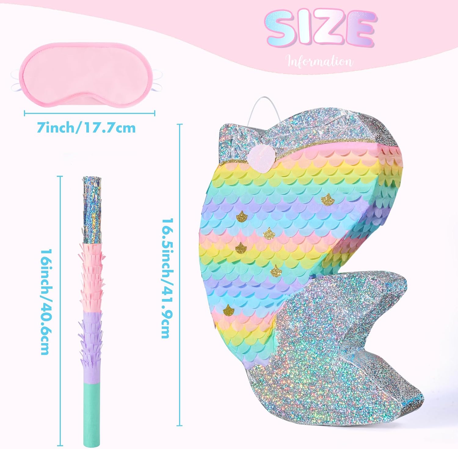 - PACKAGE INCLUDES - Glitter Mermaid Party Supplies Set Includes: 1 mermaid piñata , 1 eye mask, 1 piñata stick, and 1 sticker sheet. With our party supplies, you can easily enjoy a fun-filled game without the extra preparation!