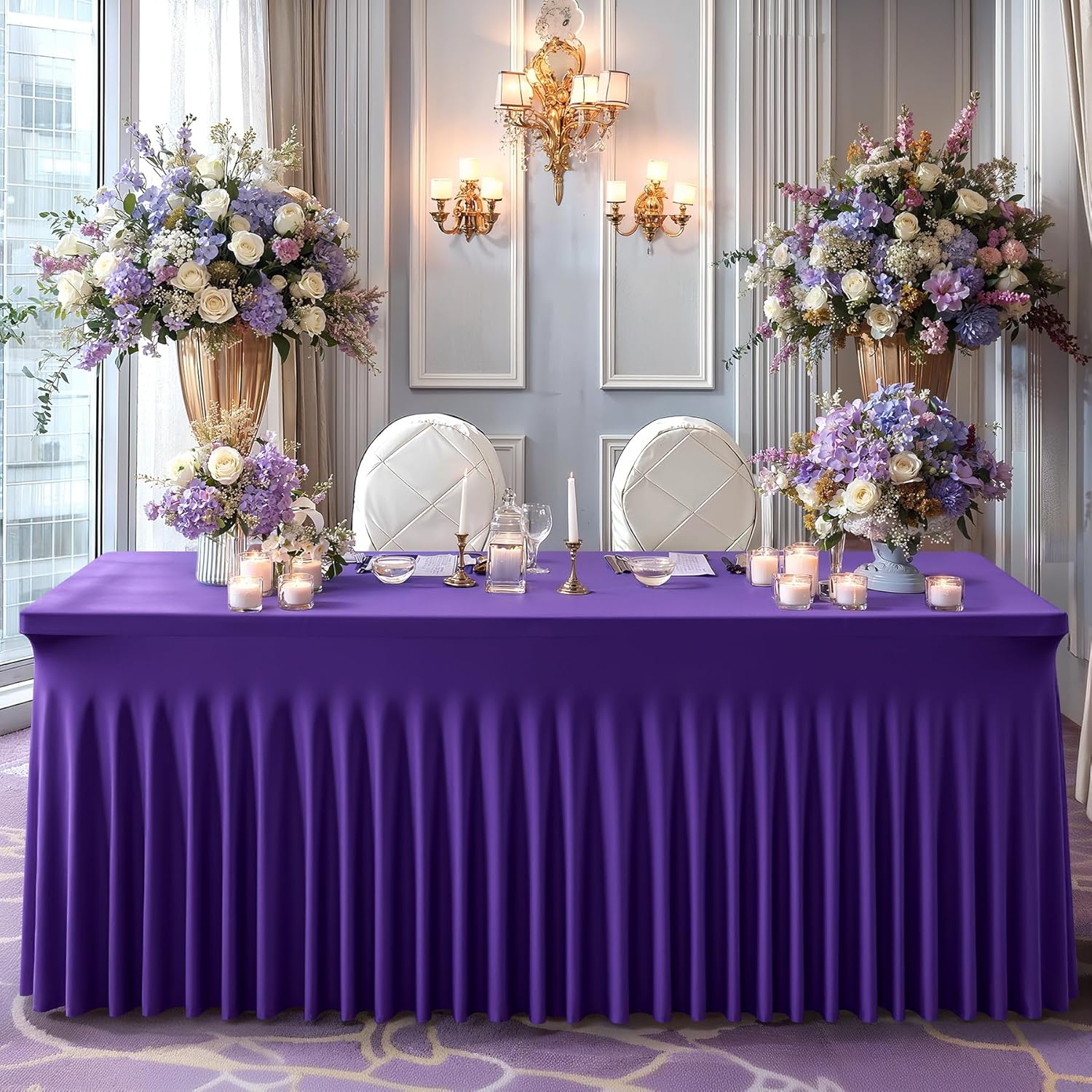 6 Pack Dark Purple Spandex Table Clothes for 8 Foot Rectangle Tables, 8FT Wrinkle Free Fitted Tablecloths Ruffles Design Table Cover for Party, Banquet, Wedding and Events