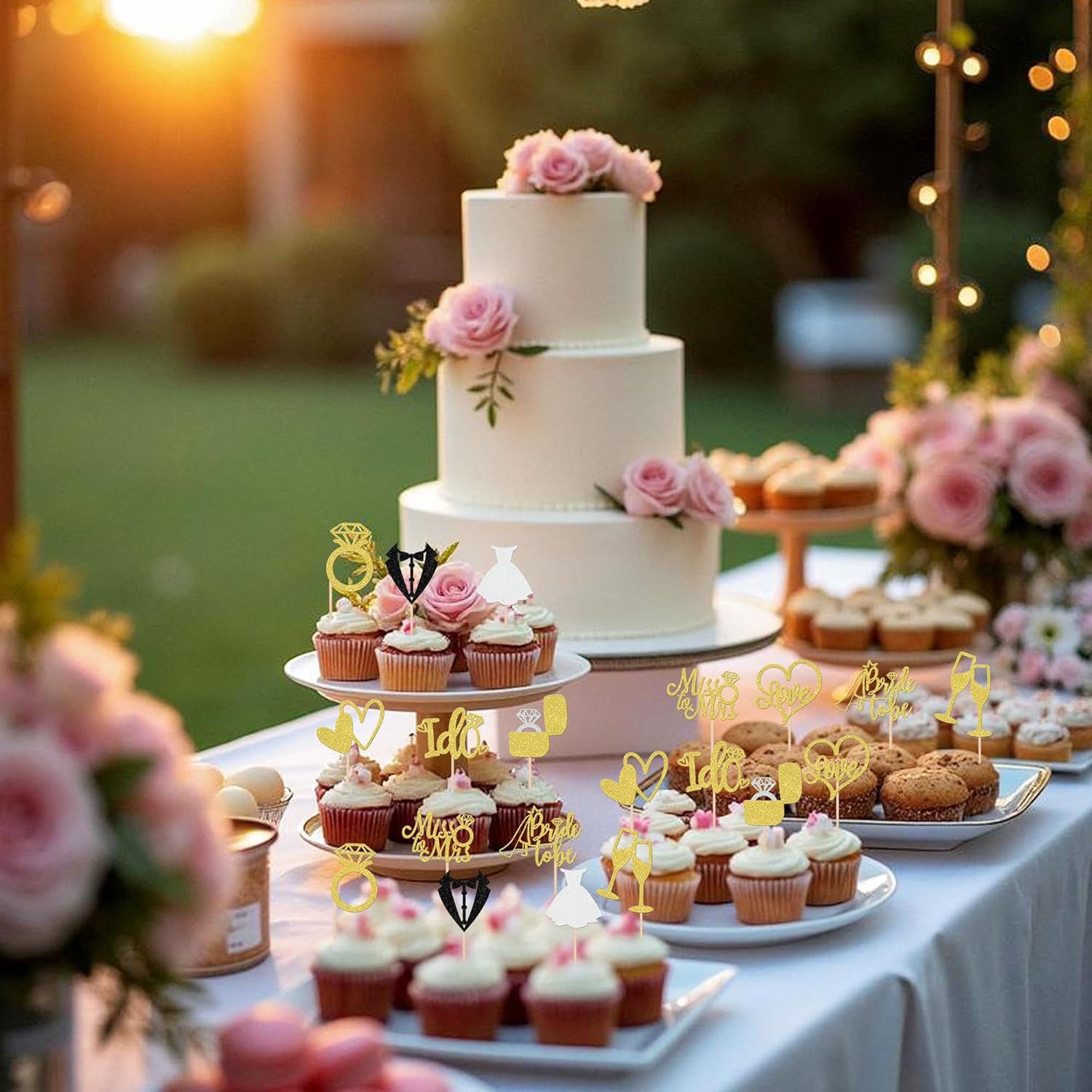 30 PCS Bride to Be Cupcake Toppers Glitter Wedding Cupcake Toppers I Do Love Heart Ring Miss to Mrs Cupcake Picks for Bridal Shower Wedding Engagement Party Cake Decorations Supplies Gold