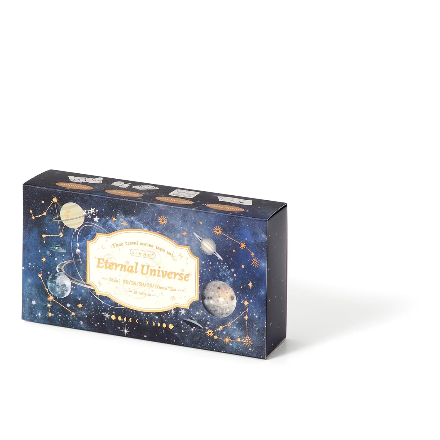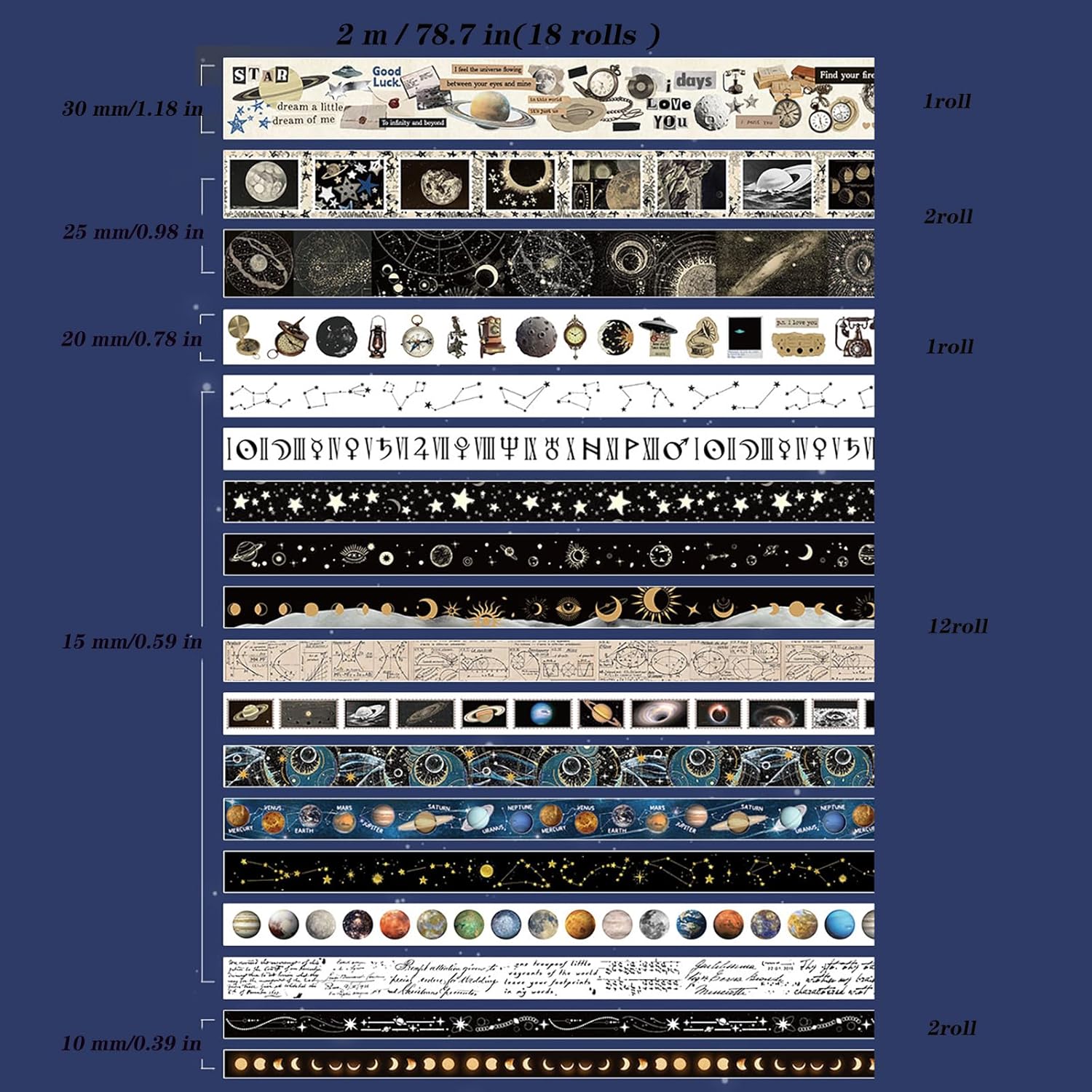- Our celestial washi tape comes in a box with 18 rolls of high-quality washi tape in five sizes, including wide and thin washi tape. Each roll is 1.18 inches (30 mm) x 1 tape; 0.98 inches (25 mm) x 2 tapes; 0.78 inches (20 mm) x 1 tape; 0.59 inches (15 mm) x 12 tapes; 0.39 inches (10 mm) x 2 tape.