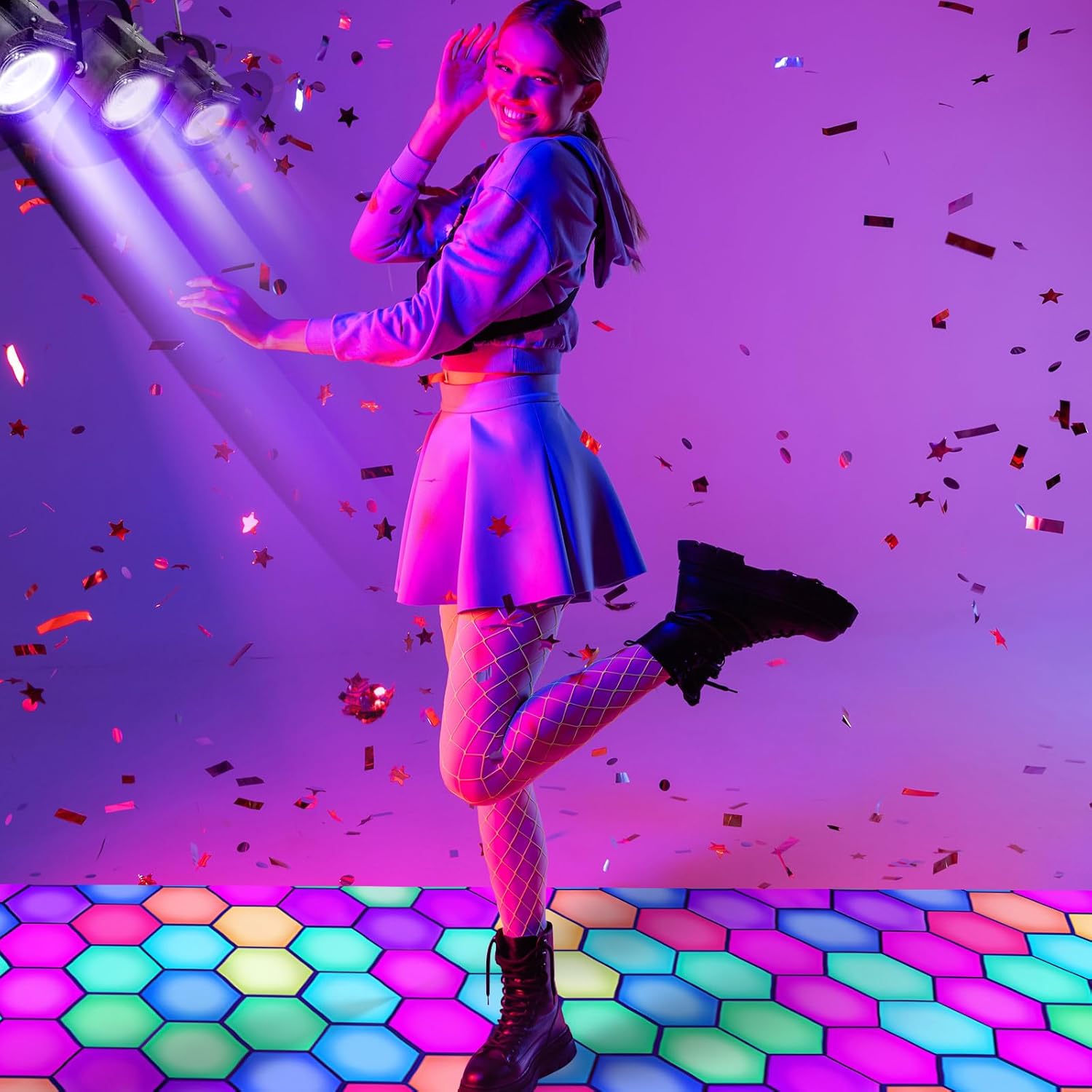 - Bright Fluorescent Color: the light up dance floor shines brightly under UV blacklight, with fluorescent orange, fluorescent red, fluorescent green, fluorescent yellow, and fluorescent blue hexagons staggered against each other, making it simple to draw the attention of others; Please note that it will have the effect of fluorescence, but it needs to be irradiated by purple lamp to have the effect; If it is not irradiated, it is a normal pattern