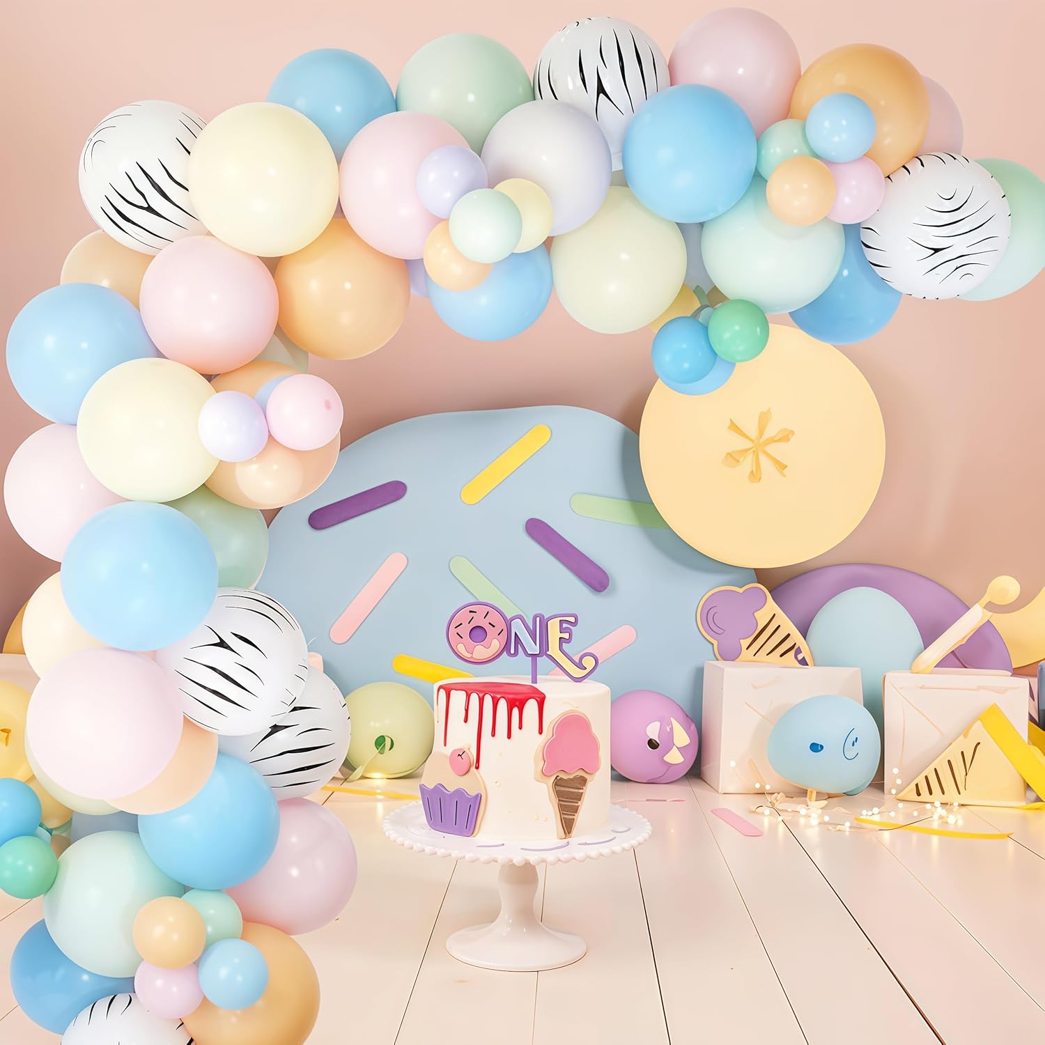 - What You Get - Pastel Rainbow and Zebra Balloon Garland Arch Kit, package including 8pcs 12 inches zebra printed balloons, 60pcs 10 inches balloons(macaron blue*10, macaron pink*10, macaron green*10, macaron orange*10, macaron yellow*10, macaron purple*10), 48pcs 5 inches balloons(macaron blue*8, macaron pink*8, macaron green*8, macaron orange*8, macaron yellow*8, macaron purple*8), 1 roll of 5 meters balloon strips, 1 roll of ribbon, 5pcs dot glues. Total 123 pcs, all in one package!