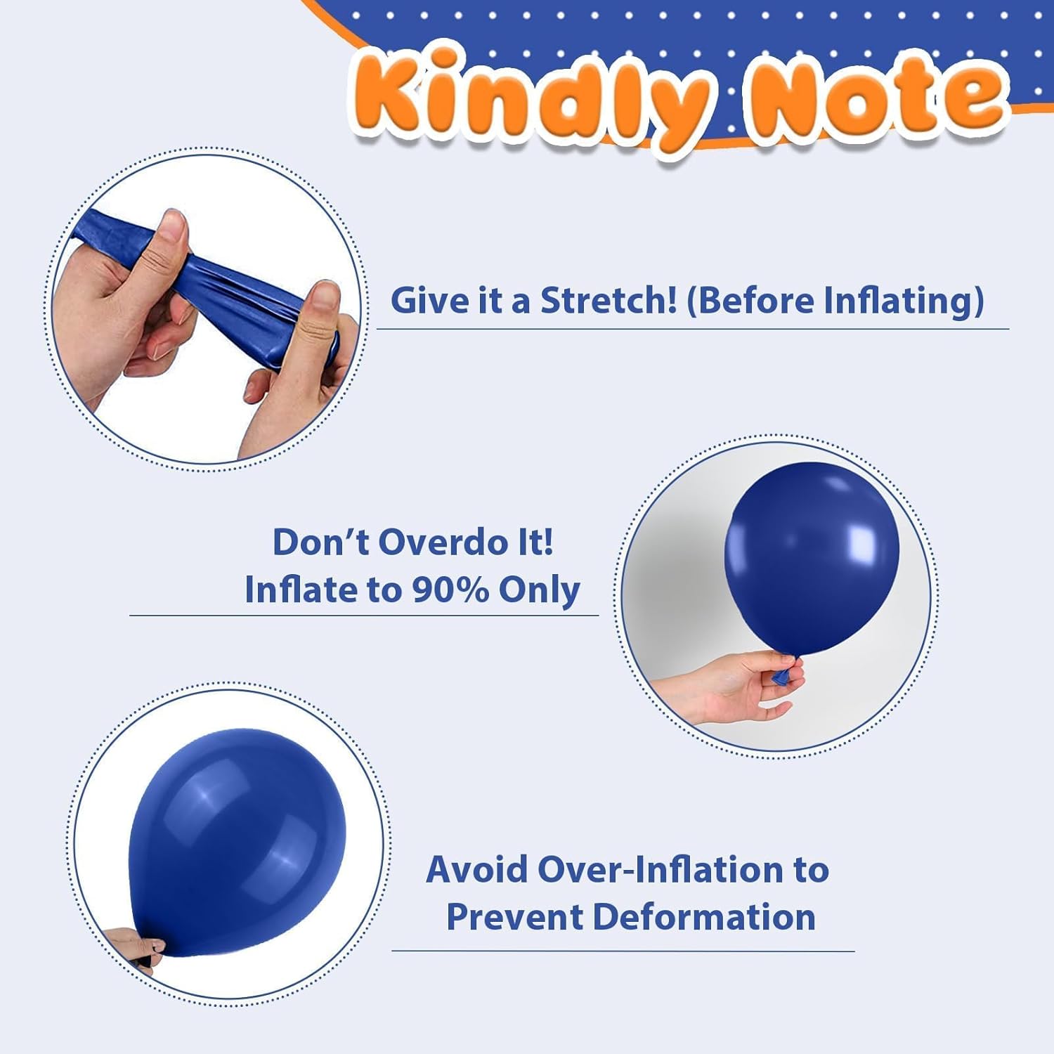 - Party-Ready Tips: Please be careful not to overfill the balloon to avoid bursting,away from sharp objects and direct sunlight to prevent damage. Please note that it is normal for 2-3 balloons out of the all to have some damage or small holes. If you have any questions or need assistance, please don't hesitate let us know.We will help you within 24 hours.